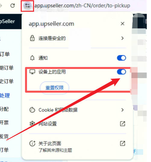 如果已安装打印插件但仍报错,这是由于新版 Chrome 浏览器的安全策略默认限制了网站对本地网络的访问。请按以下步骤操作:在浏览器地址栏左侧点击锁形图标,开启「设备上的应用」权限,刷新页面后即可正常使用。