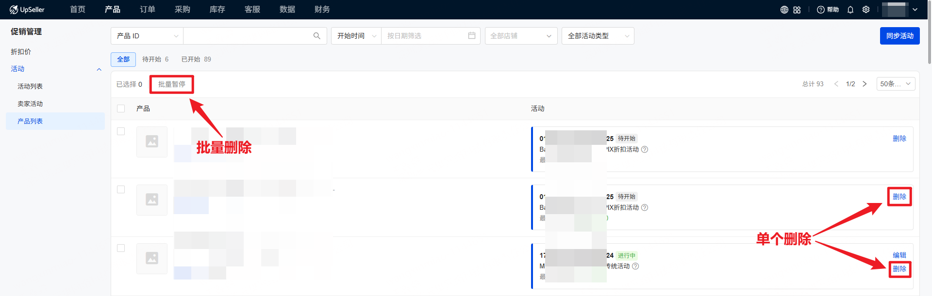 当想删除“待开始”或 停止参与“已开始”的促销活动时,UpSeller支持单个/批量删除促销活动