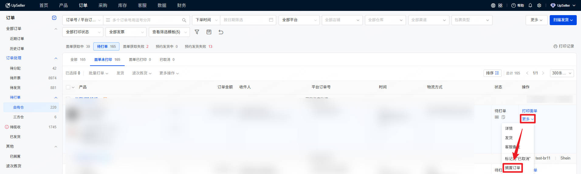 情况二:当订单处于“待打单>>自有仓”状态时,点击 更多>>搁置订单。订单进入“已搁置”状态后,即可切换仓库!