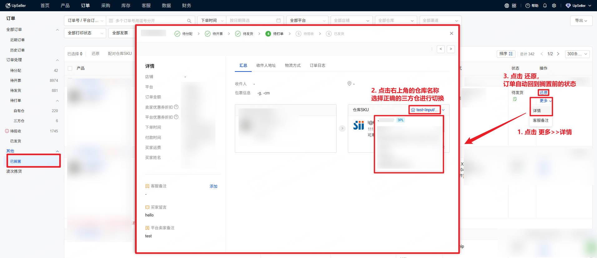 注意:切换仓库成功后,需点击“还原”,将订单还原至“待打单>>三方仓”状态