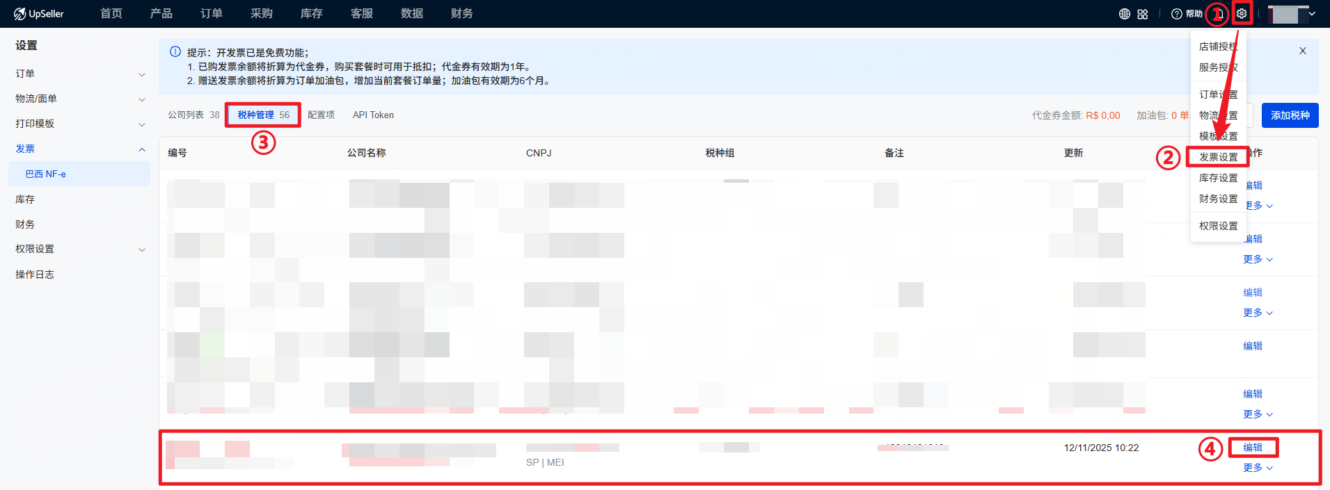 2. 前往发票设置:https://app.upseller.com/pt/settings/invoice-account/brazil-NF-e