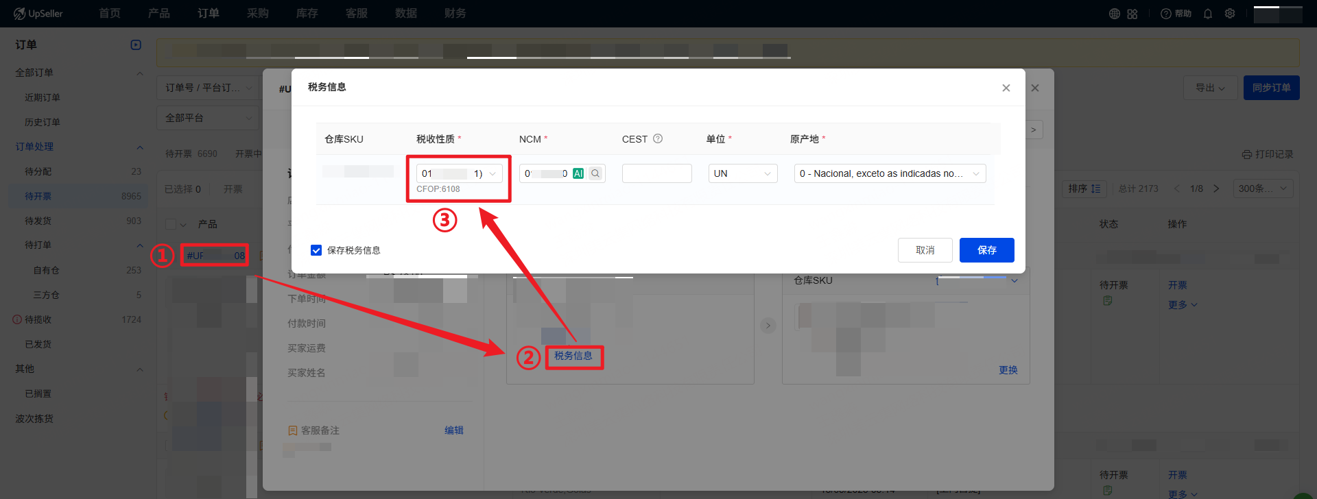 1. 点击 详情→税务信息→税收性质,查看订单使用的税种编码及CFOP是哪个。确认后,继续步骤 2