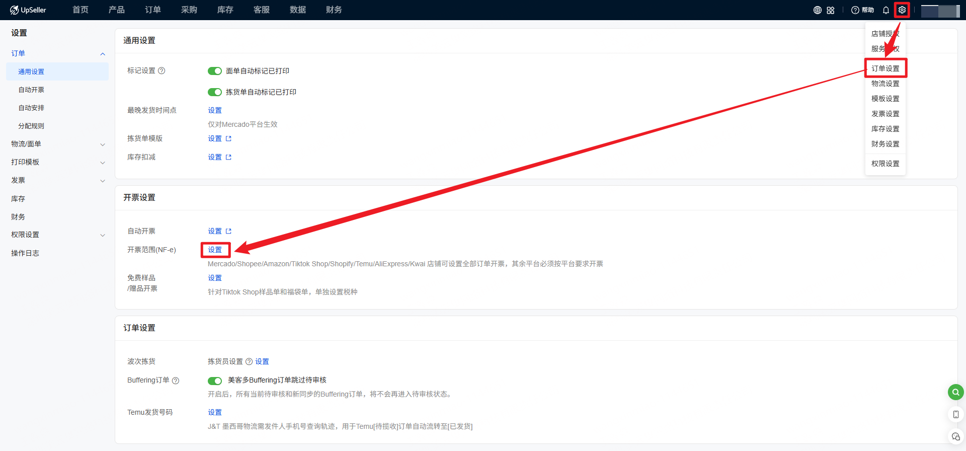 首先您需要确认平台是否要求开票。巴西邮政(Correios)、Mercado Envios、Mercado Envios Flex、Mercado Envios Turbo、Shopee Xpress CPF 以及 Amazon 线下物流不要求开票。如果平台不要求开票,订单默认跳过【待开票】状态,进入到【待发货】列表中。若想要为这些物流的订单开发票,可以在UpSeller进行设置。
