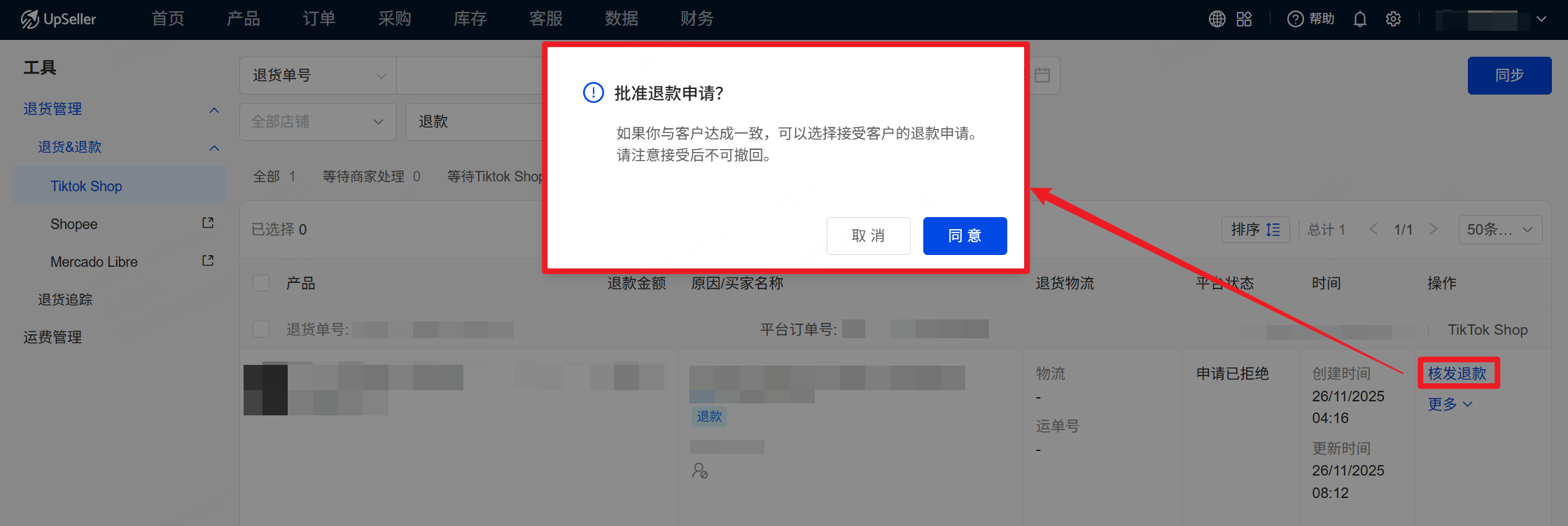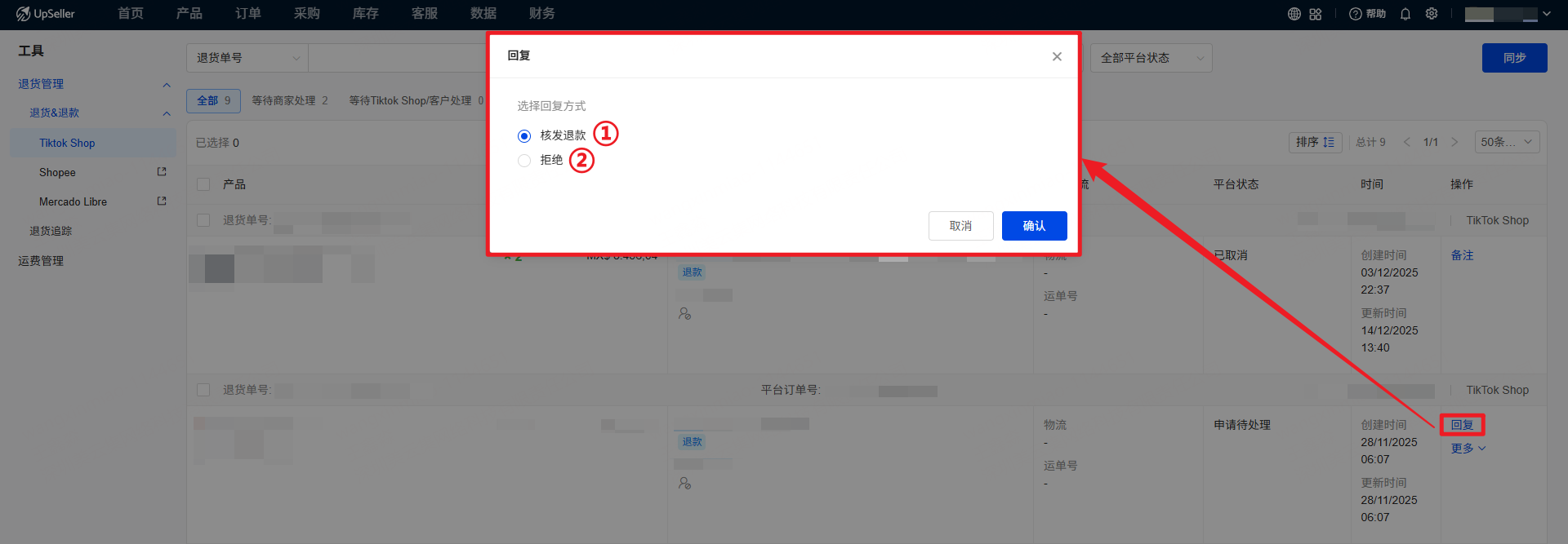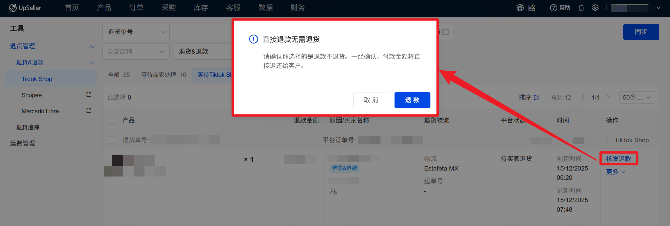 用户可以在 UpSeller 查看 TikTok Shop 仅退款 和 退货&退款 的订单,并处理买家的退货和退款申请二、操作入口