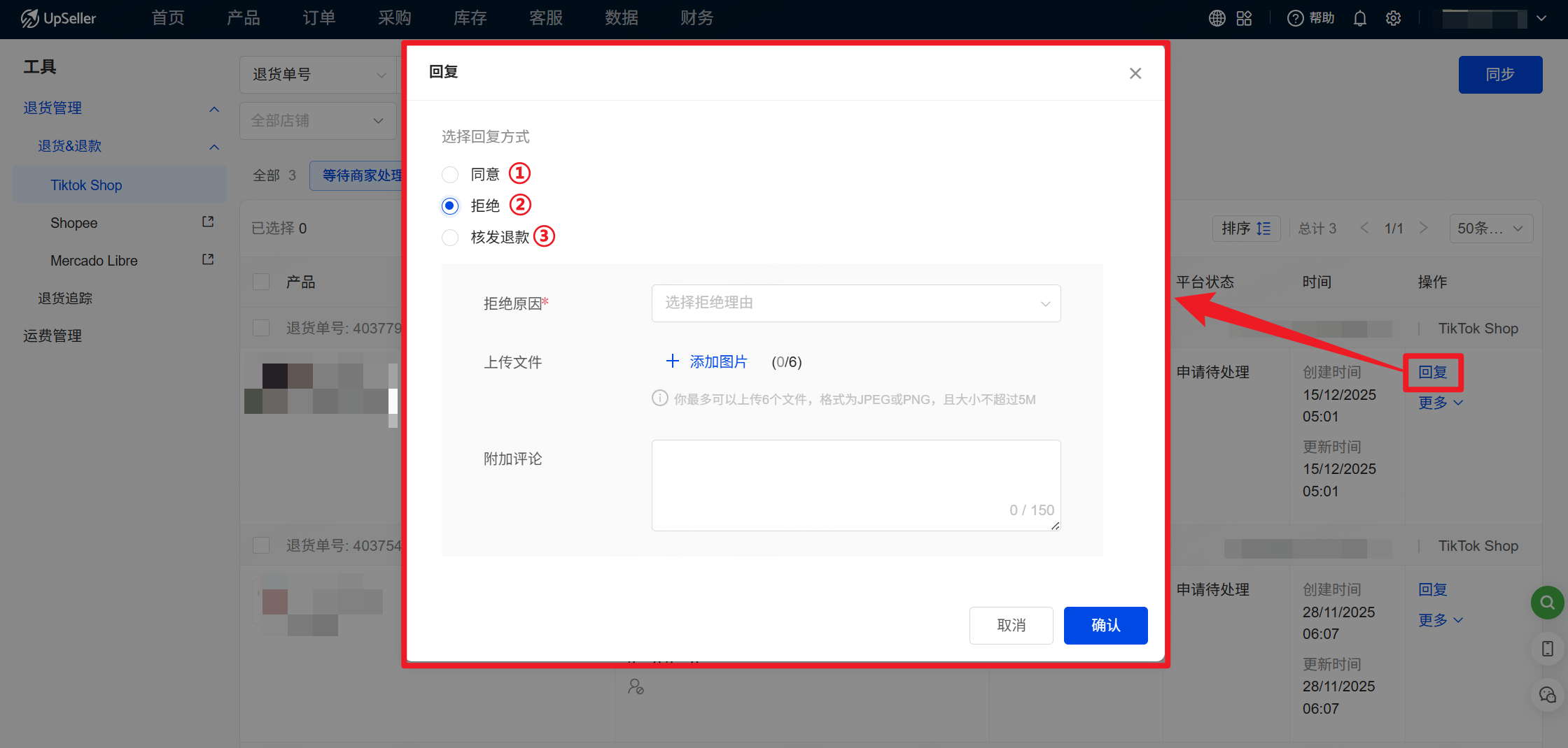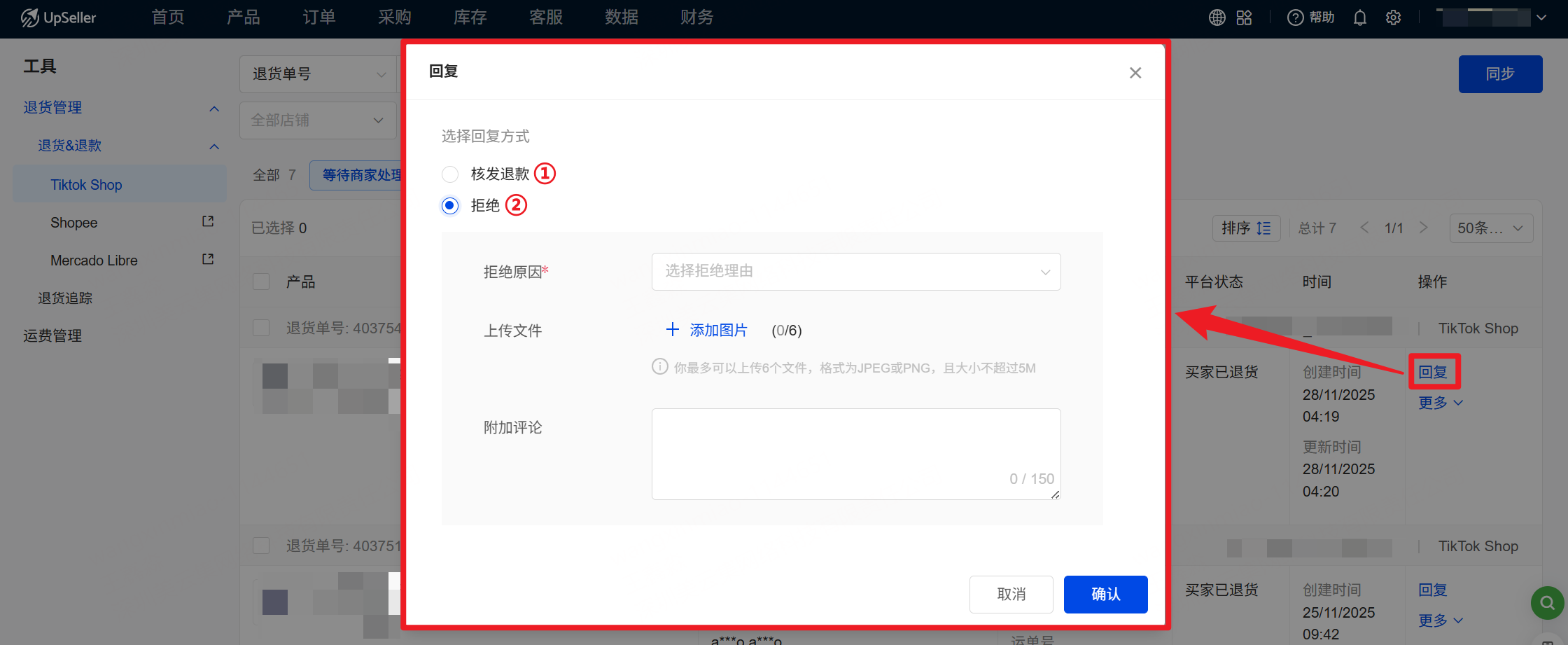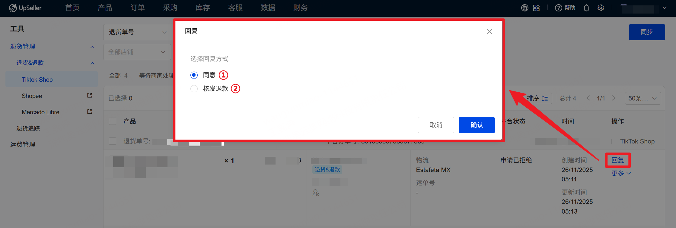用户可以在 UpSeller 查看 TikTok Shop 仅退款 和 退货&退款 的订单,并处理买家的退货和退款申请二、操作入口