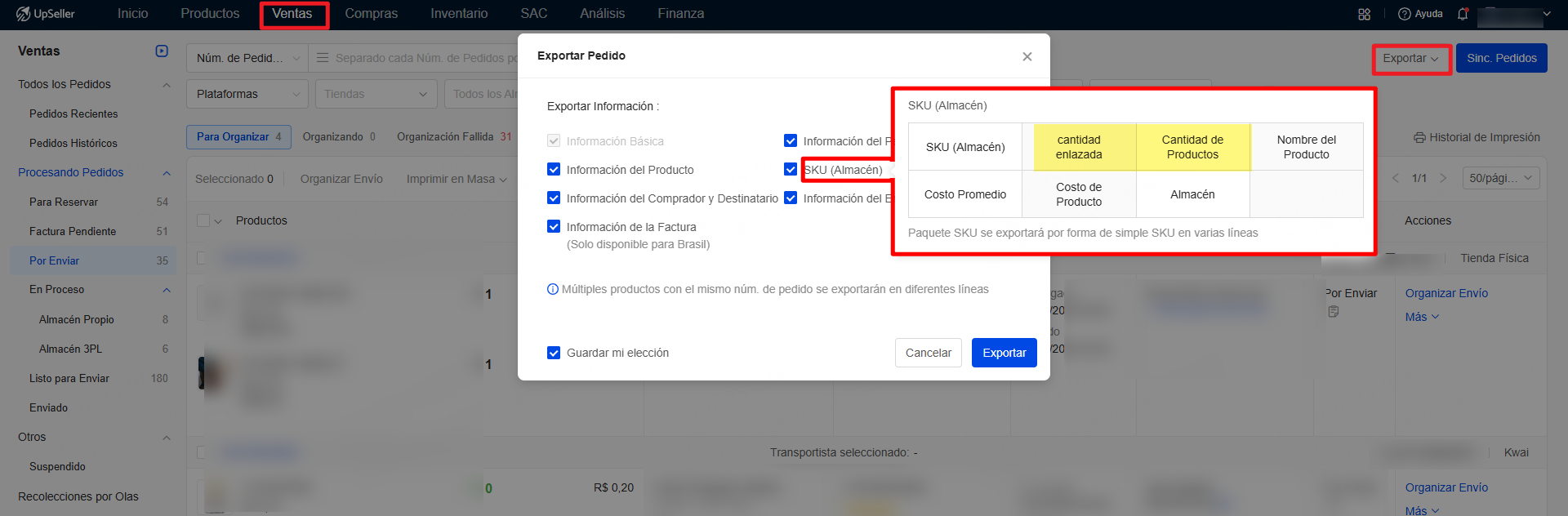 [Ventas] Añade la información de la cantidad de productos enlazados a cada pedido al exportar pedidos