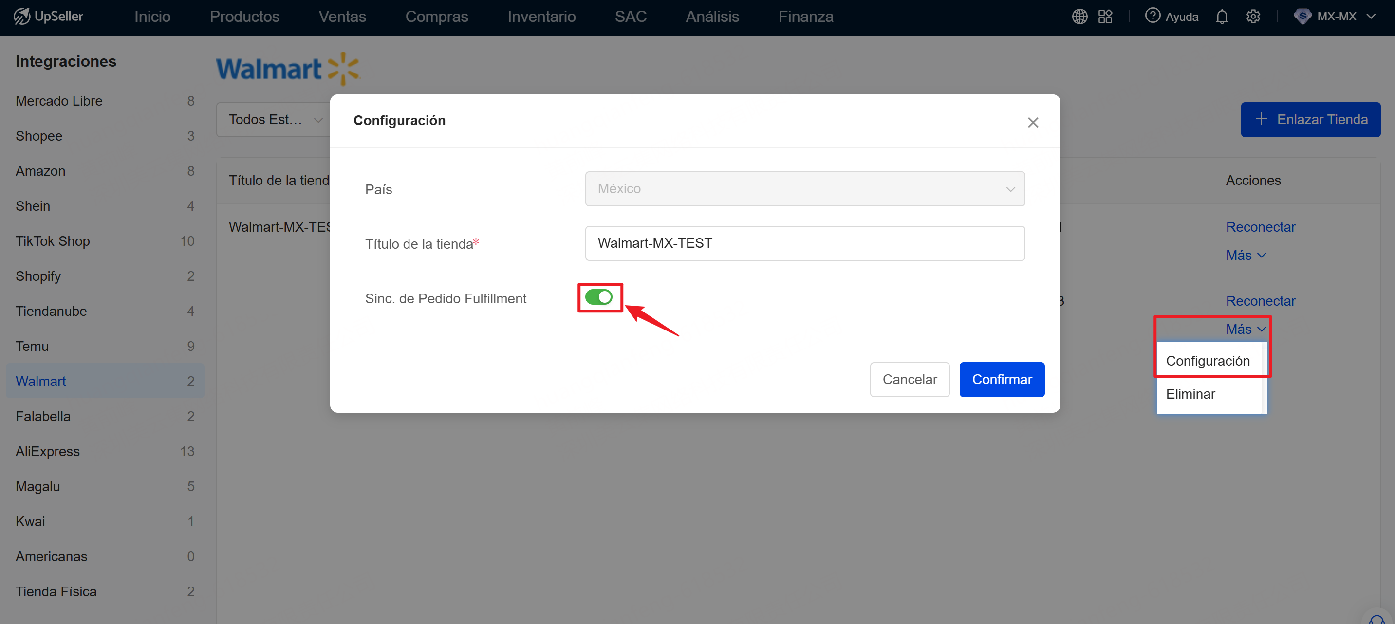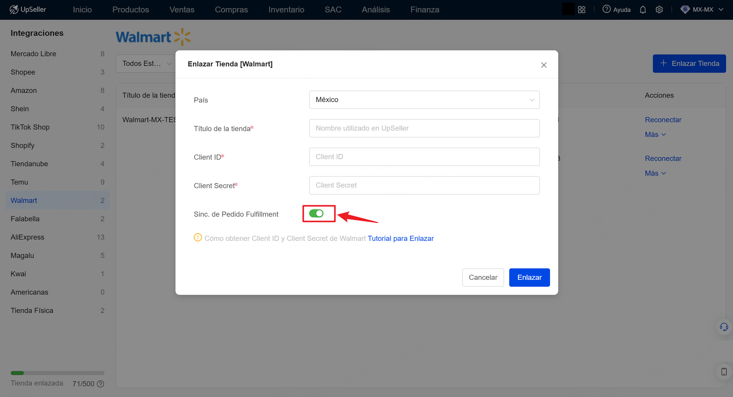 1. Al enlazar la tienda, puedes elegir si deseas habilitar o no la Sinc. de Pedido Fulfillment, es decir la sincronización de pedidos de WFS. Conoce más sobre Enlazar tu cuenta de Walmart.