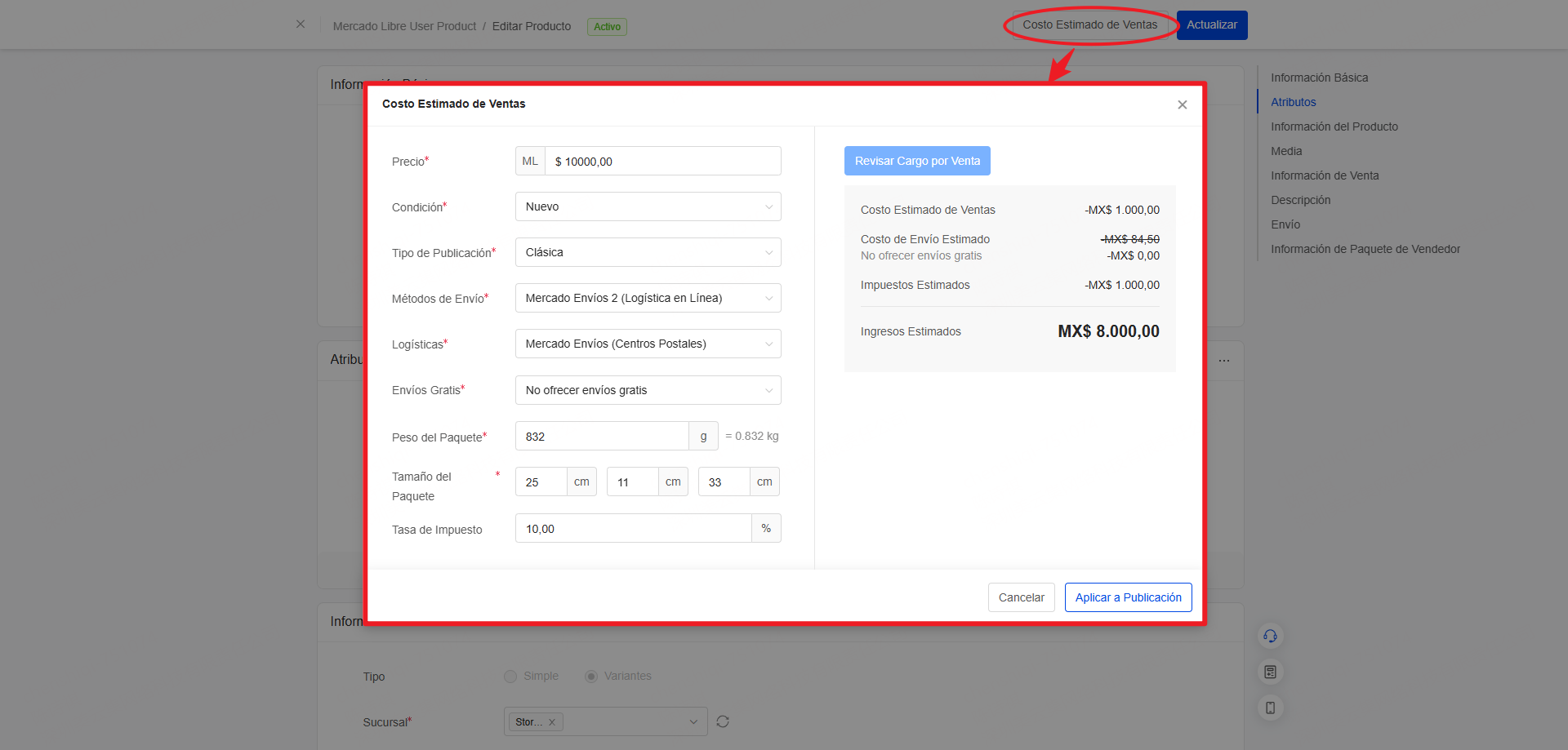 [Productos] Permite consultar el cargo por venta de productos en Mercado Libre, estimar automáticamente el costo de envío según las dimensiones del paquete, y calcular el ingreso estimado, ayudando a definir precios con mayor precisión
