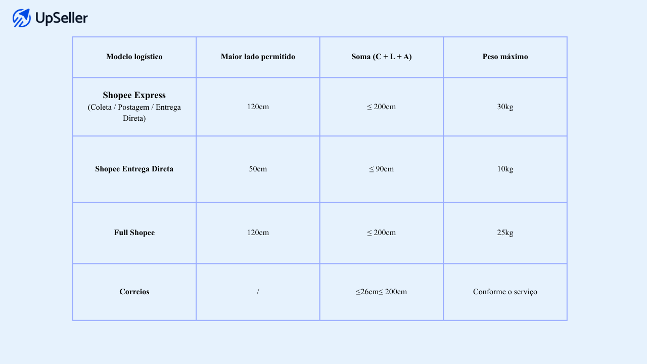 Cada modelo logístico da Shopee possui regras específicas. Para facilitar a visualização, confira a tabela abaixo:
