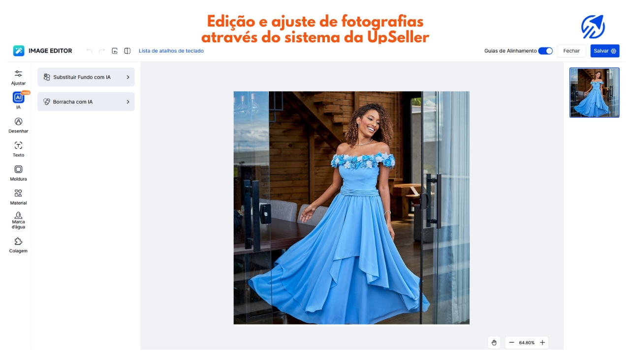 A inteligência artificial, nesse cenário, não perde relevância. Pelo contrário: ela se consolida como uma aliada para aprimorar imagens reais, corrigindo iluminação, enquadramento e cores, sem eliminar a naturalidade do material. É exatamente assim que a ferramenta de IA do UpSeller atua na criação de seus anúncios!
