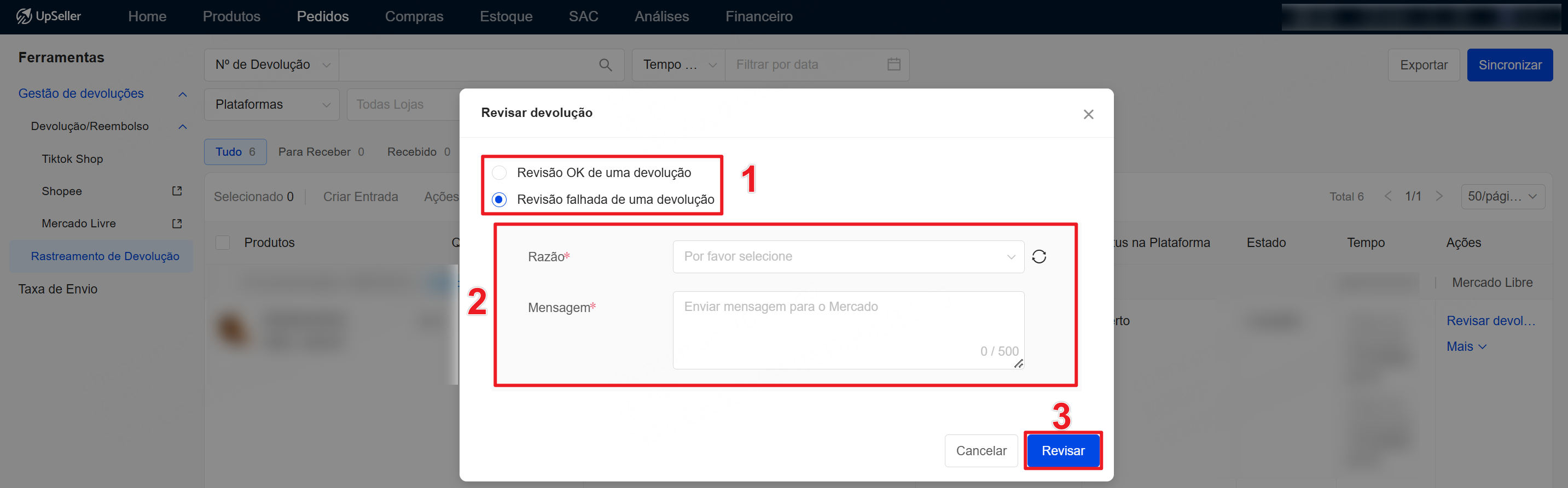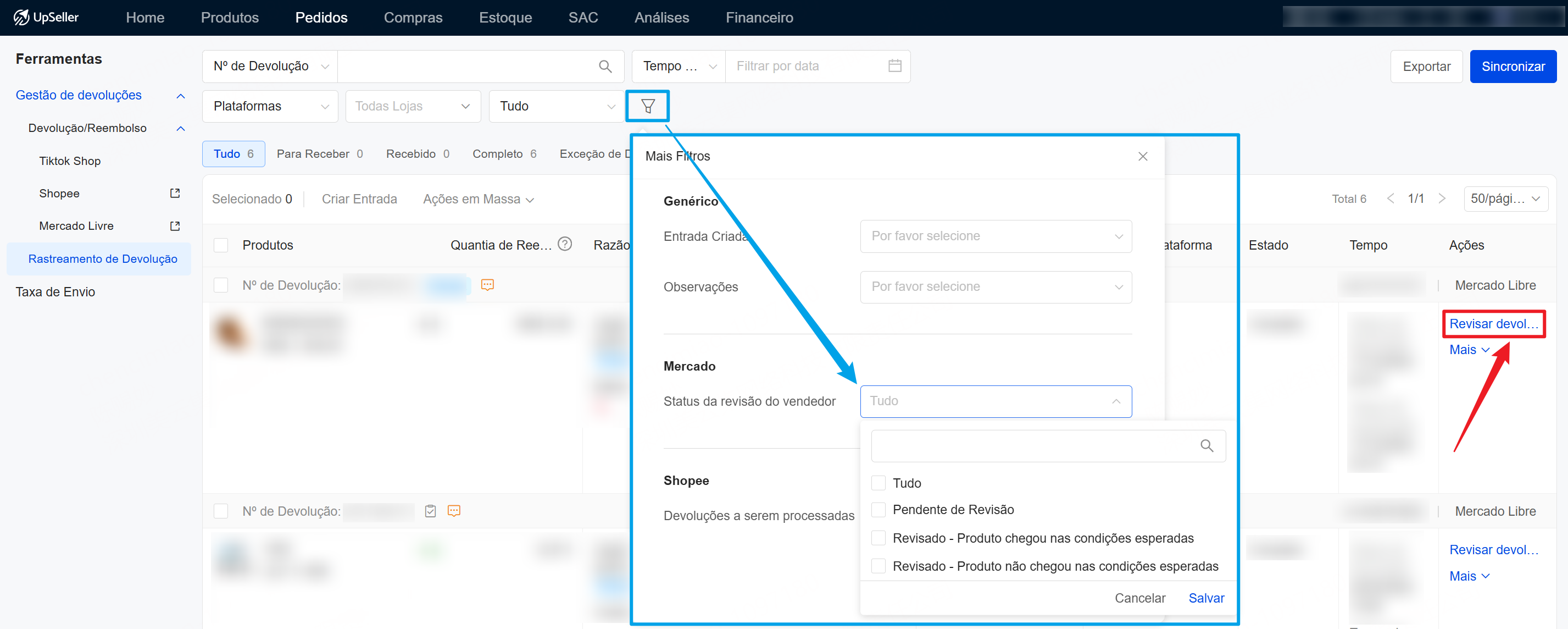 ③ Status: ao clicar, é possível ver o valor do reembolso, motivo da devolução, nome do comprador, logística da devolução, data, status na plataforma e status no UpSeller.