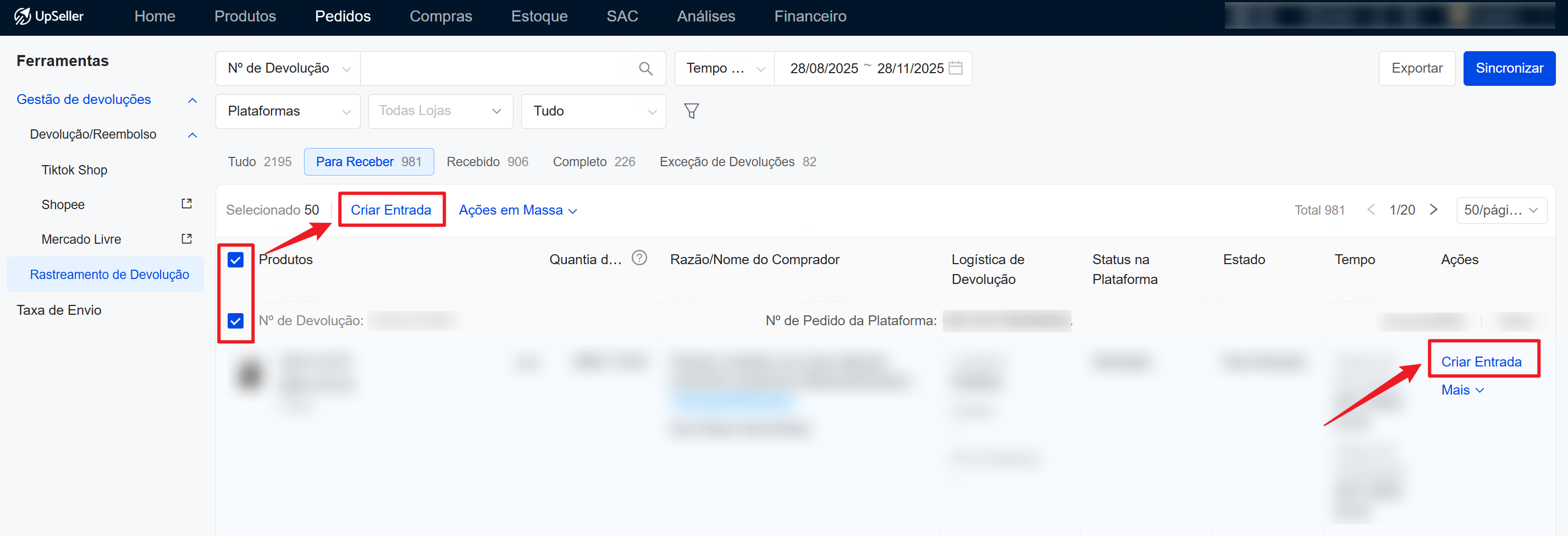 Esta função é utilizada para verificar e exportar pedidos de devolução de Shopee,Mercado, SHEIN e TikTok Shop utilizado para analisar o volume e os produtos de pedidos de devolução. Ao mesmo tempo, é possível criar Entrada para colocar produtos de pedido de devolução no Estoque, o que ajuda a gestão de Estoque