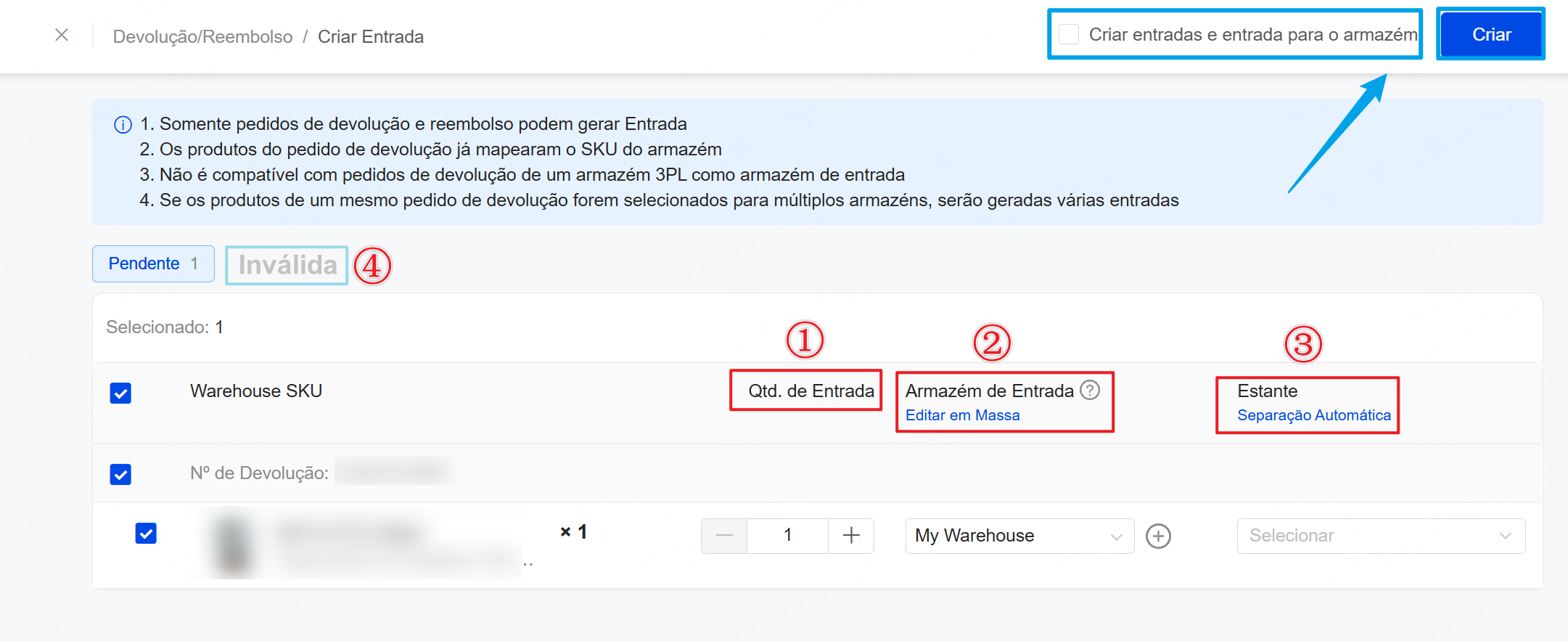 4. Se os produtos de um mesmo pedido de devolução forem selecionados para múltiplos armazéns, serão geradas várias entradas