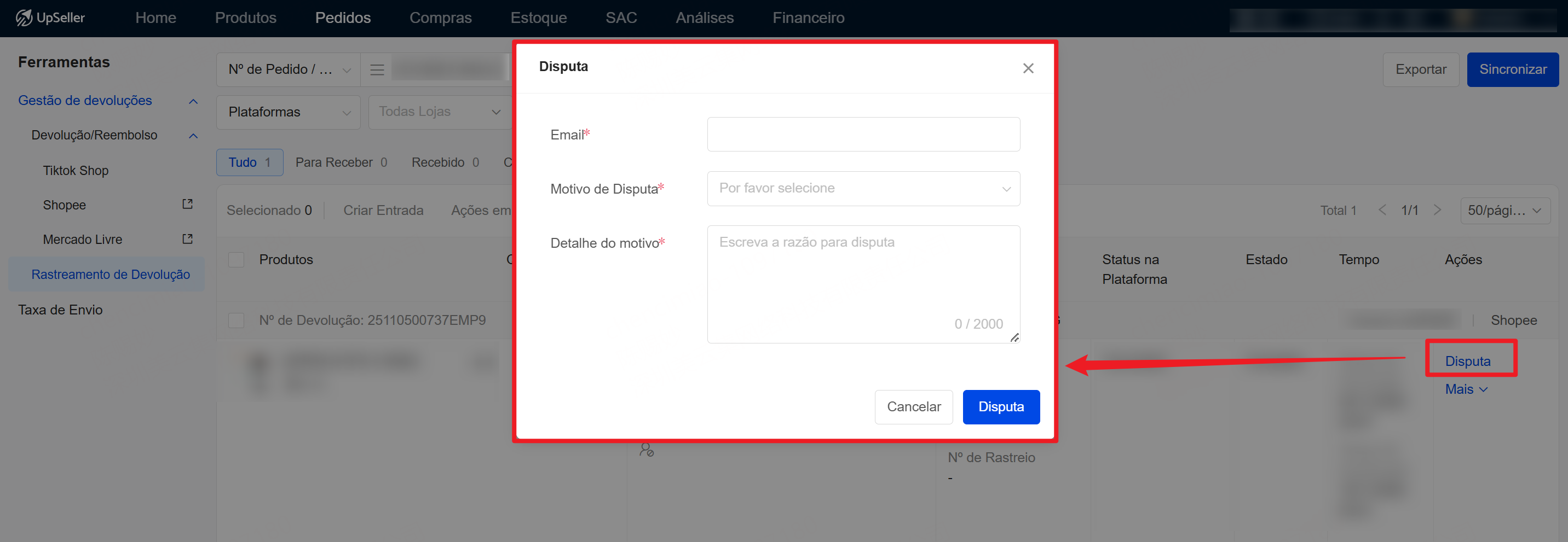Atualmente, é possível apenas a visualização de pedidos de Devolução & Reembolso das plataformas Shopee, Mercado Livre, Shein e TikTok Shop. Pedidos de somente reembolso não serão exibidos.