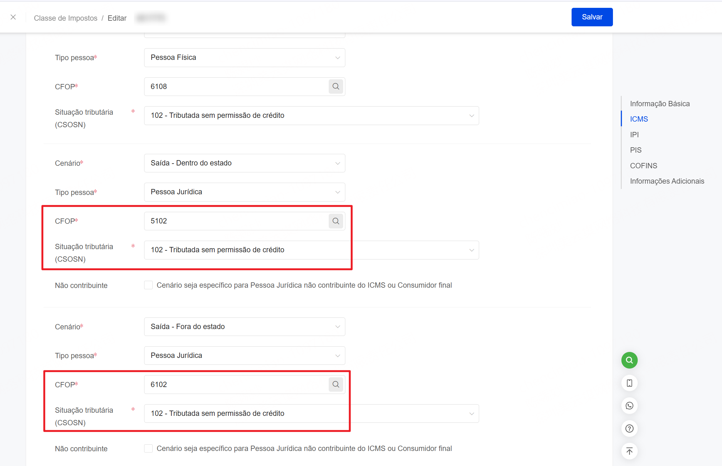 Passo 2: Acesse Classe de Impostos, encontre o imposto correspondente >> Editar >> Sob a orientação do contador, altere o CFOP