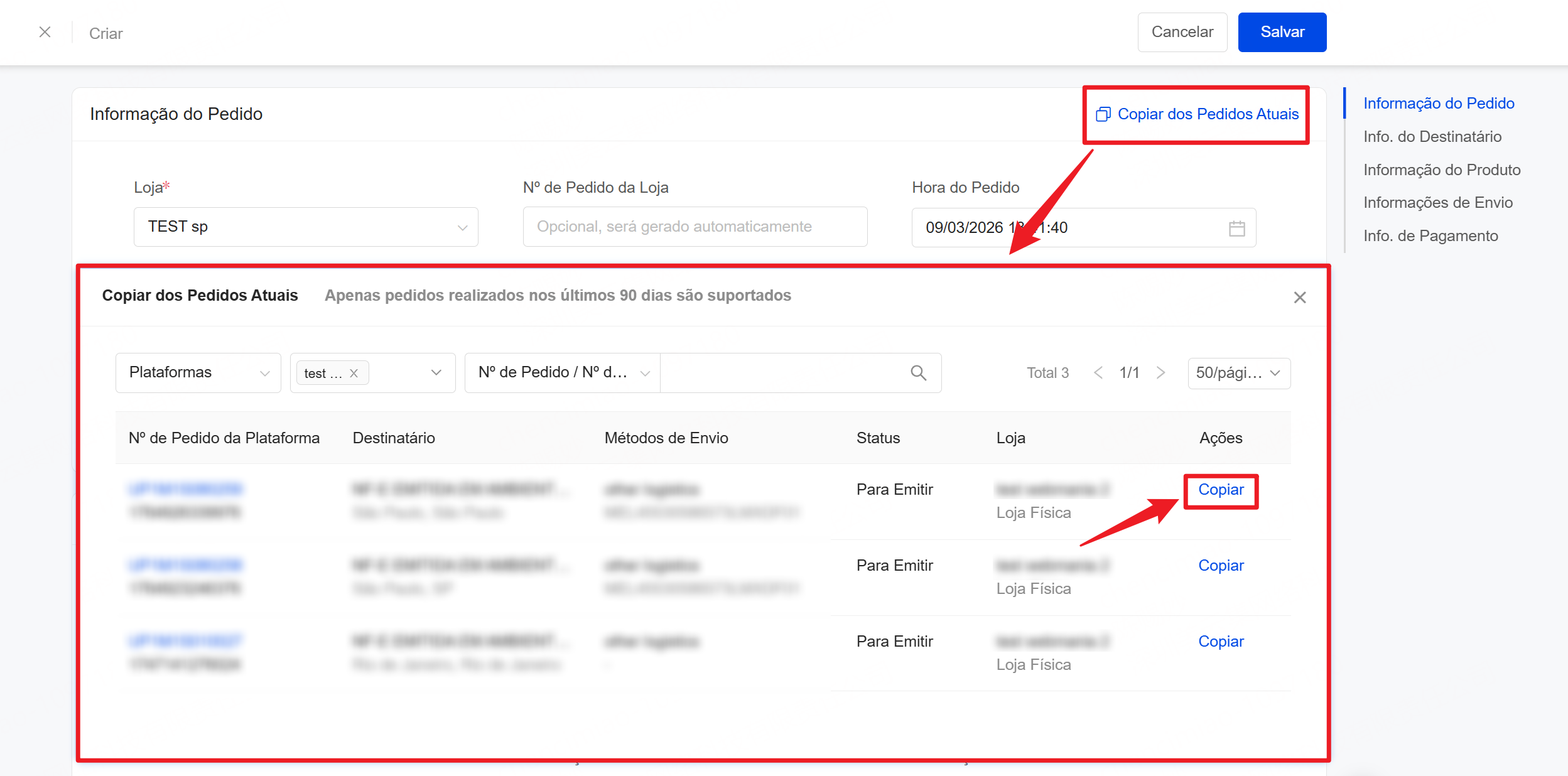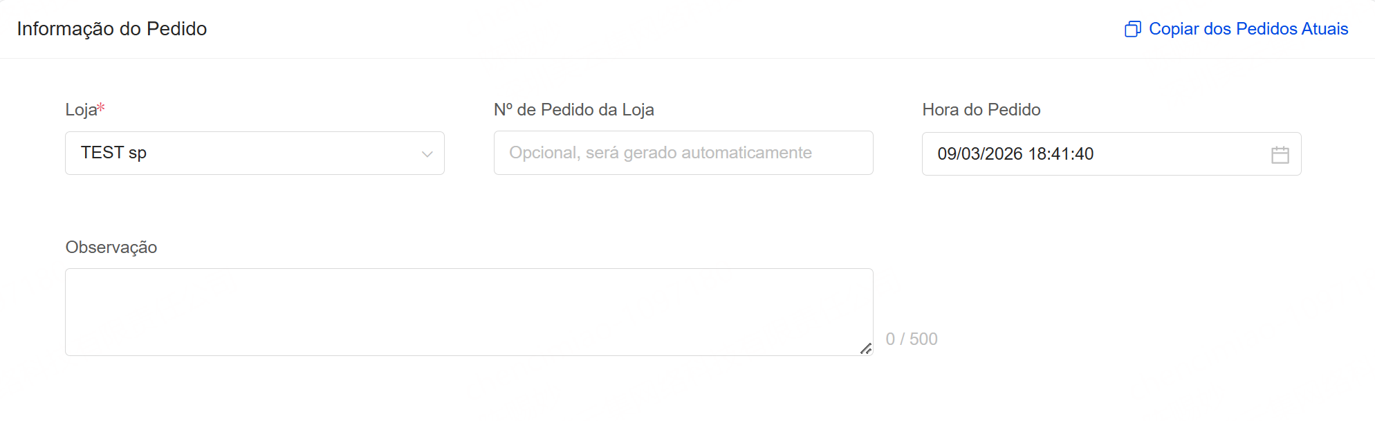Clique em "Copiar dos Pedidos Atuais" >> Selecione o pedido >> Confirme a cópia. Todos os dados do pedido existente serão replicados, permitindo ajustes.