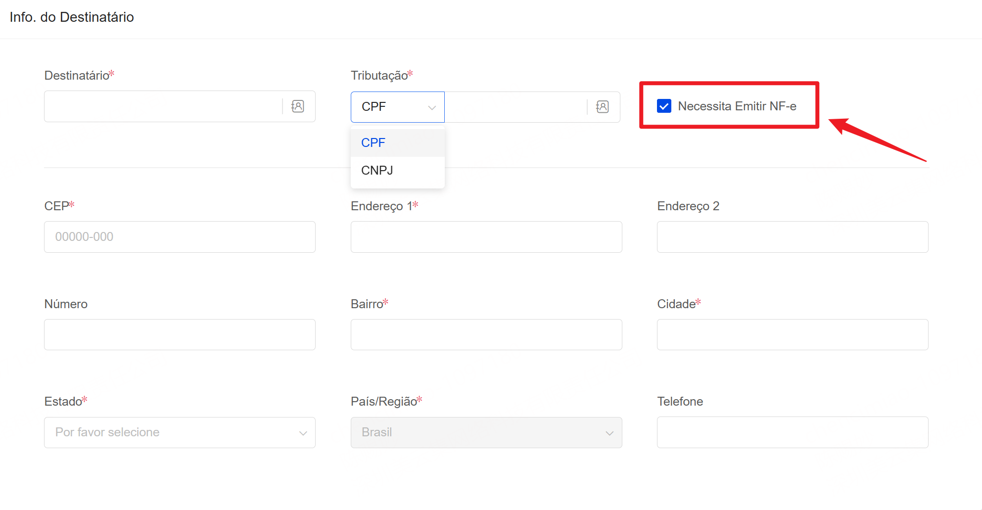 OBS: É obrigatório que os campos do destinatário estejam preenchidos em caracteres em inglês, para atender aos requisitos da Receita Federal Brasileira e garantir sucesso na emissão da NF-e.