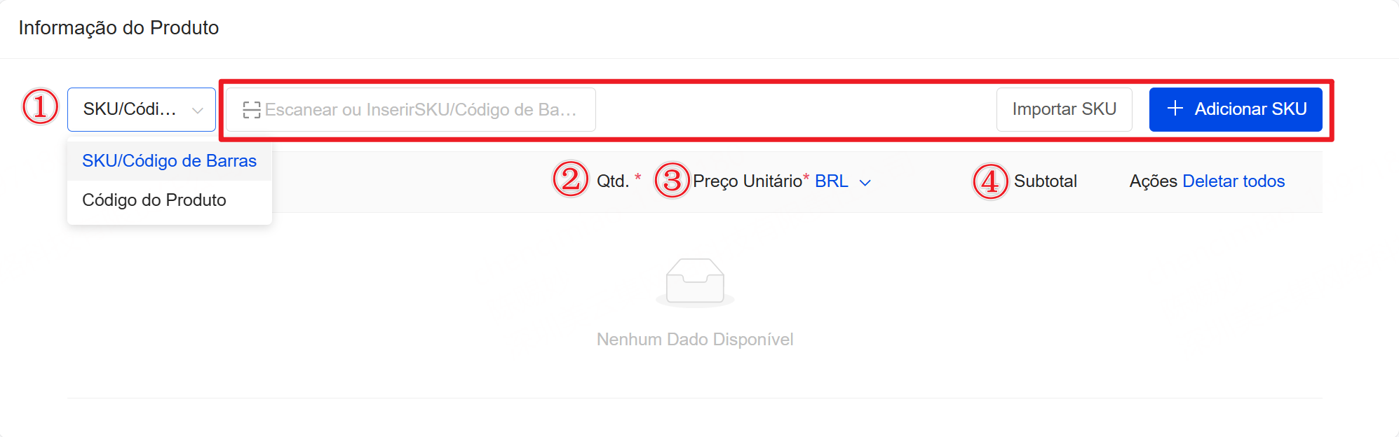 ① Adicionar SKU: é possível selecionar manualmente ou escanear para adicionar produtos já cadastrados no sistema (cada pedido de venda pode conter até 300 SKU).