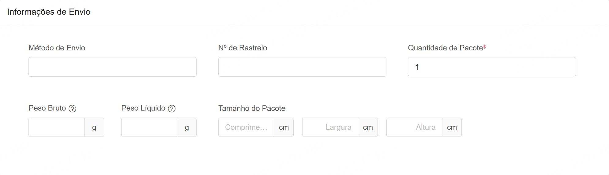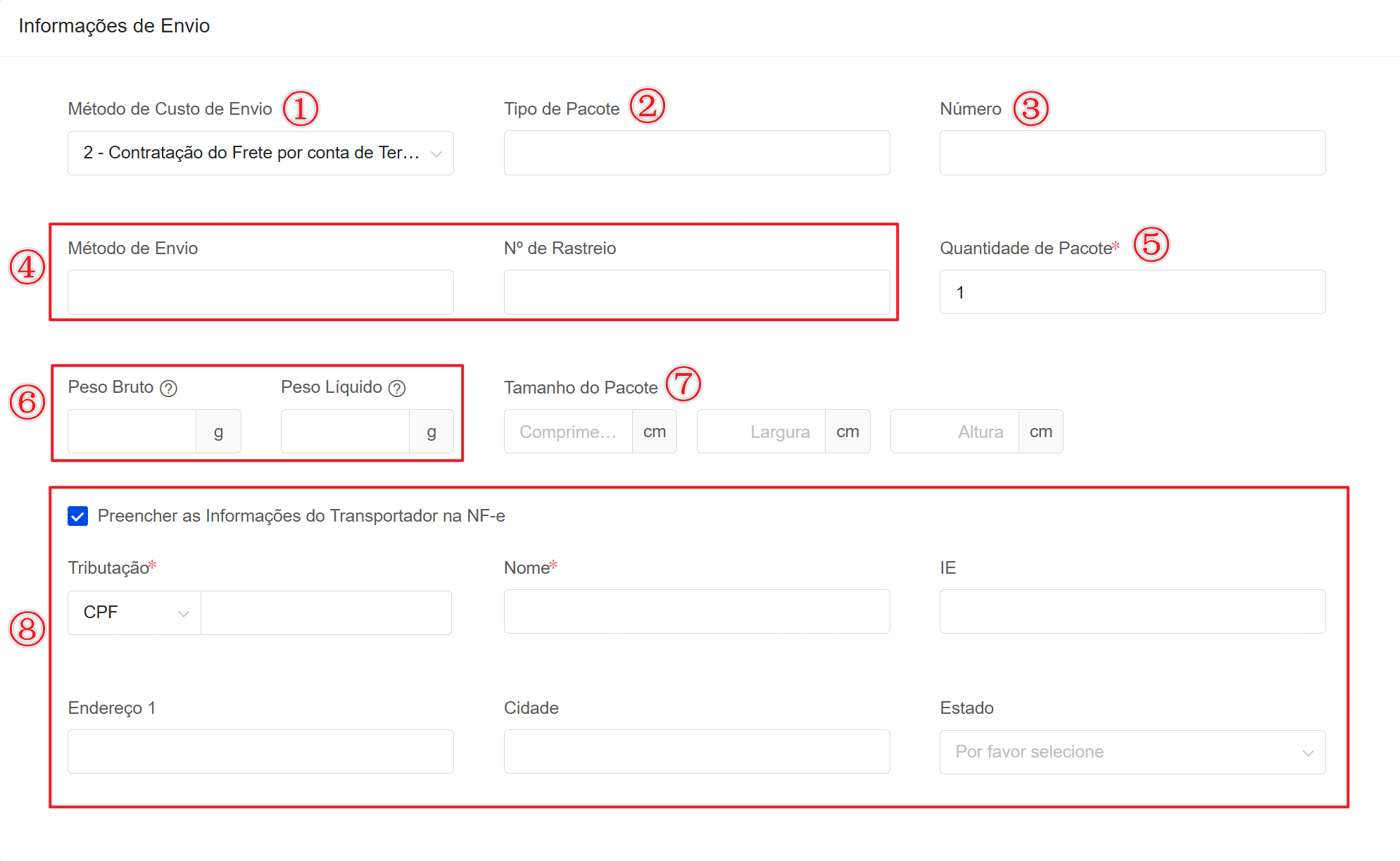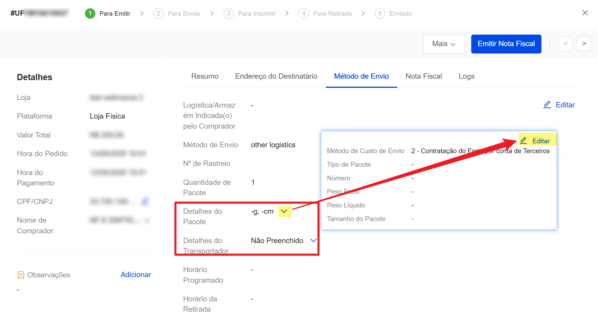 Lojas brasileiras que marcaram a opção de Necessita Emitir de NF-e: é possível preencher campos de Método de Custo de Envio, Tipo de Pacote, Número, Informações do Transportador