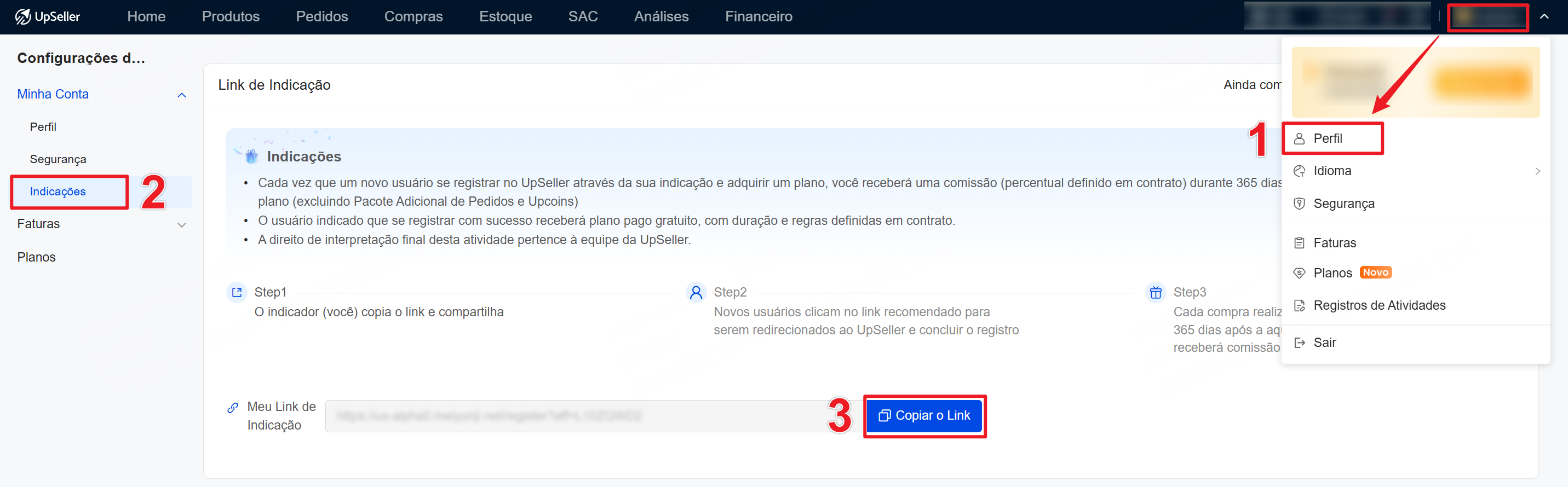 Passos: Clique em "Perfil" >> "Indicações" >> "Copiar o Link", e envie o link para o convidado. O novo usuário clicará no link de recomendação e será redirecionado para o UpSeller para completar o cadastro.