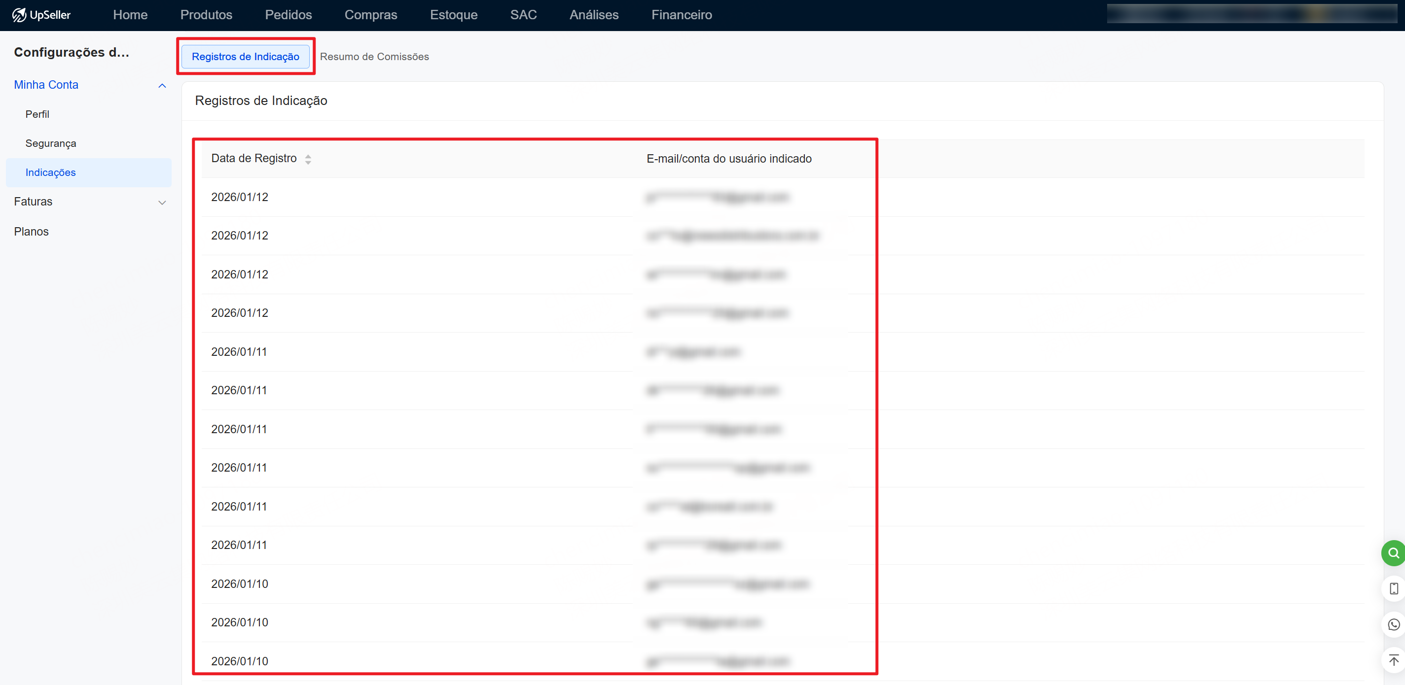 O parceiro do UpSeller pode acessar sua conta UpSeller e obter um link exclusivo para enviar aos novos usuários e visualizar o painel de indicações e comissão.