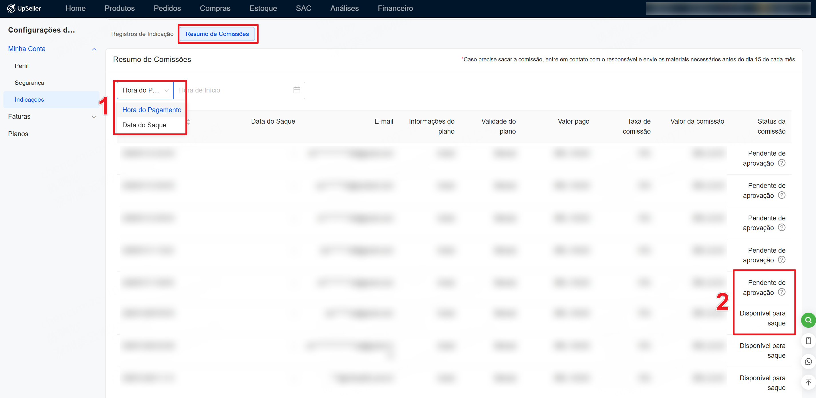 - É possível ver o status atual da comissão, ou seja, se ela está Disponível para saque, Pendente de aprovação e sacado.