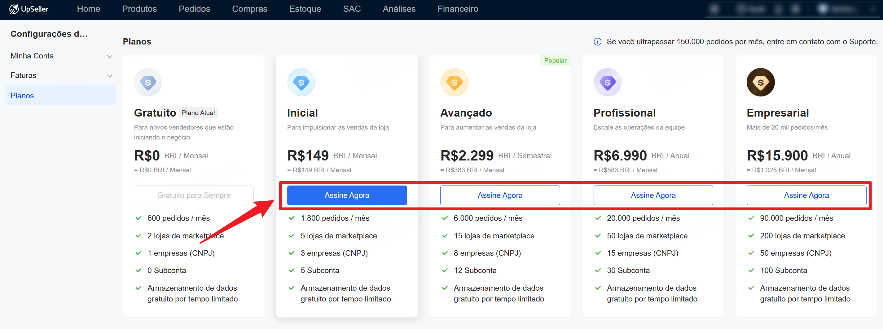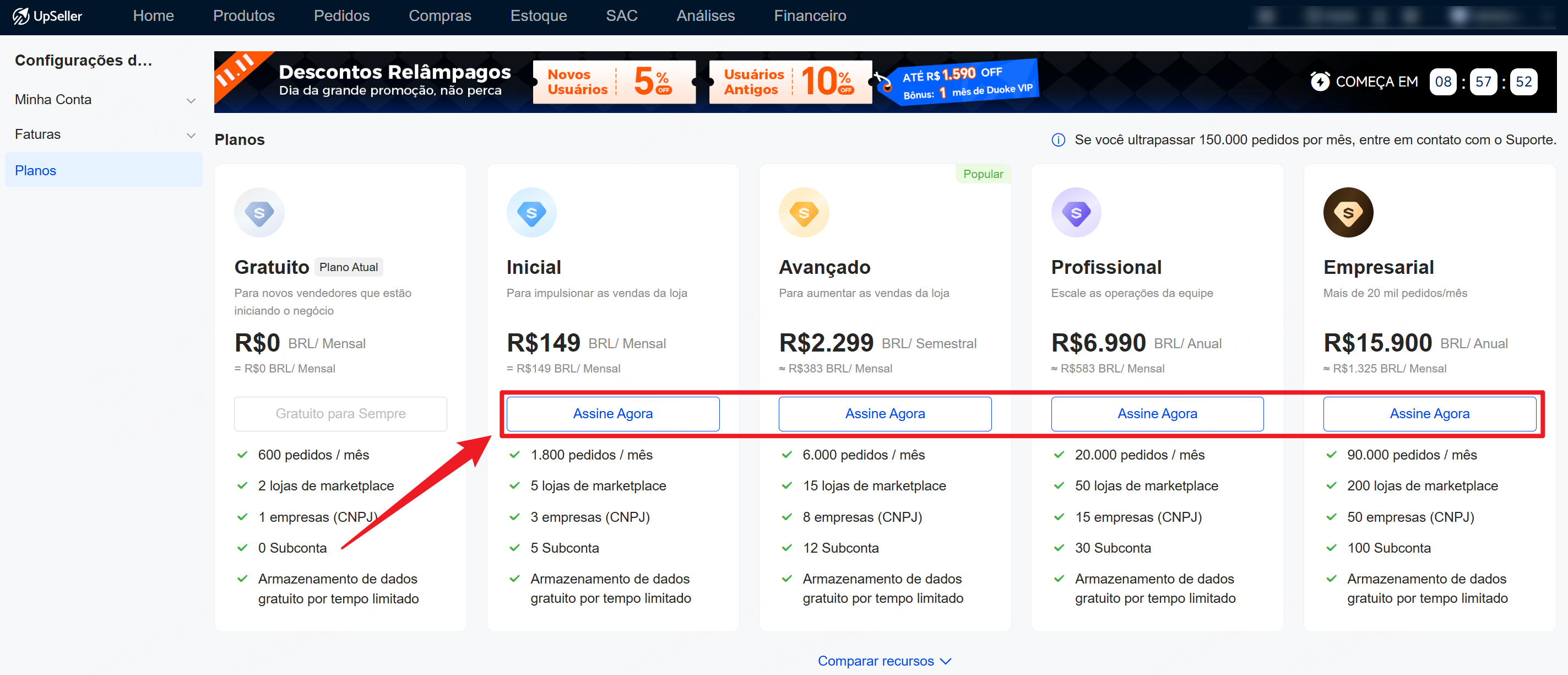 Esta promoção é válida somente para compra de planos. Pacotes adicionais de pedidos e UpCoins não participam desta promoção.III. Passos de Compra