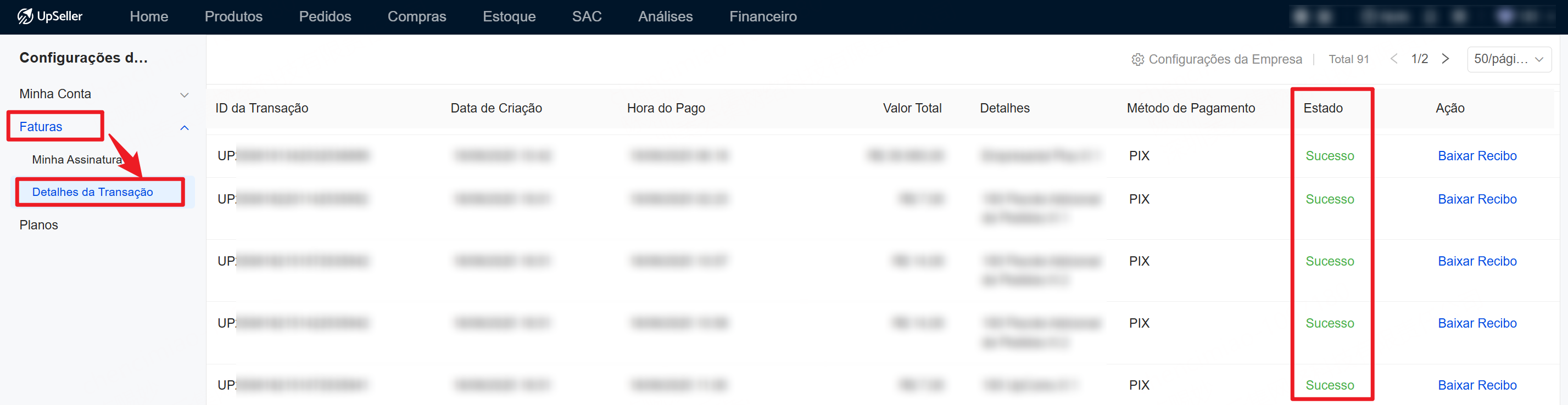 3. Após a compra, você pode clicar em "Faturas" >> "Detalhes da Transação" para verificar se o pagamento foi concluído com sucesso. Após a compra, é possível baixar o recibo, veja >> Como baixar o Recibo(Invoice) após comprar o serviço no UpSeller?