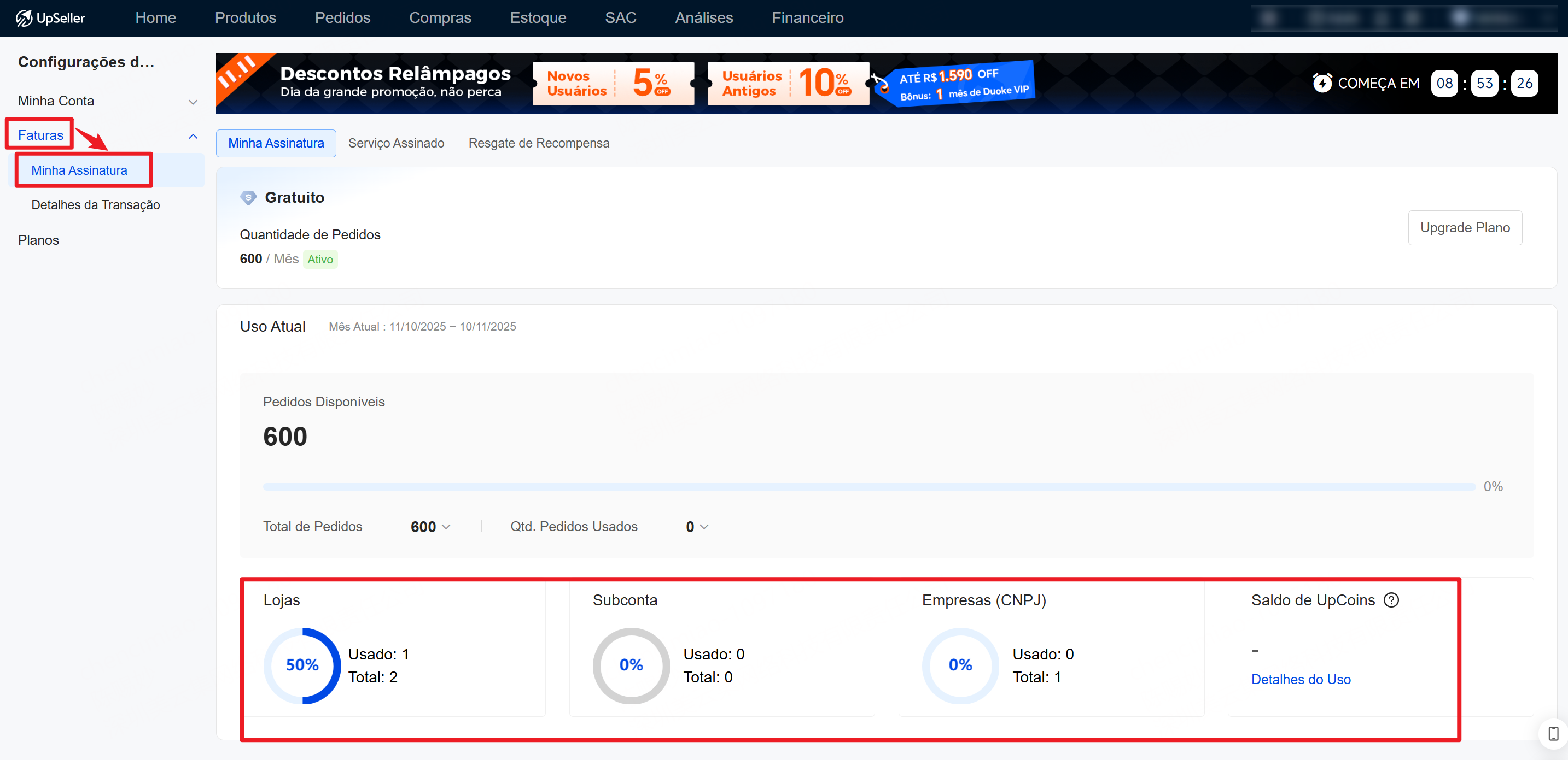4. A assinatura entrará em vigor imediatamente após a transação bem-sucedida. Clique em "Faturas" >> "Minha Assinatura" para ver os detalhes do plano. Incluindo: o período de validade do plano, a porcentagem da quantidade de pedidos usados nesse mês, o Número de Lojas/Subcontas/Empresas(CNPJ), e o Saldo de UpCoins, etc.