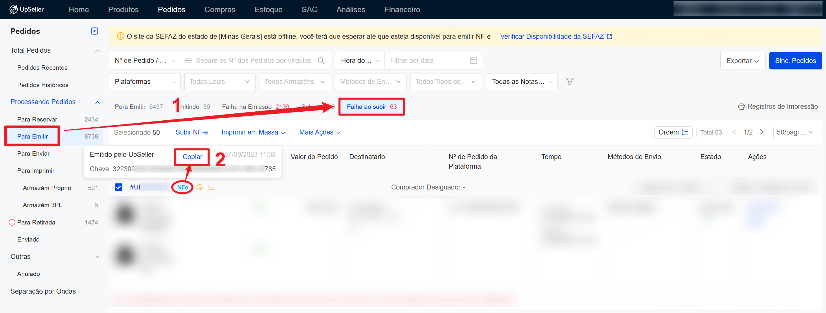 Opção 1: Acesse Pedidos >> Para Emitir >> Falha ao subir >> Copiar a Chave da NF-e.