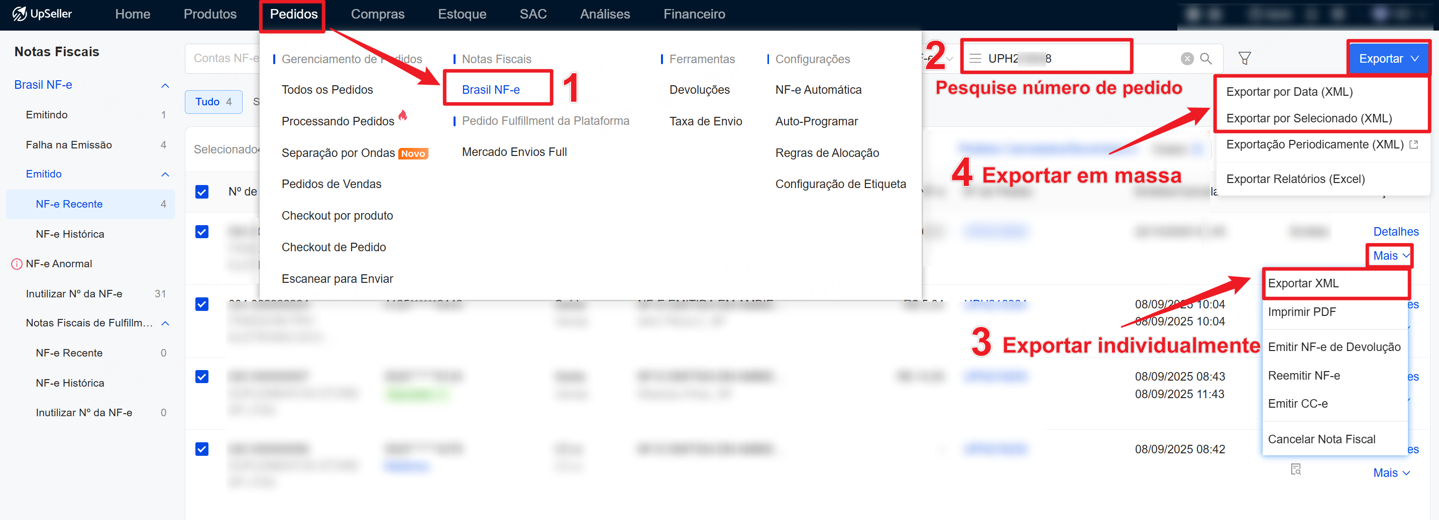 Opção 2: Acesse Pedidos >> Brasil NF-e >> Pesquise pelo número do pedido “UPXXXXXX” >> Exporte o XML individualmente ou em massa