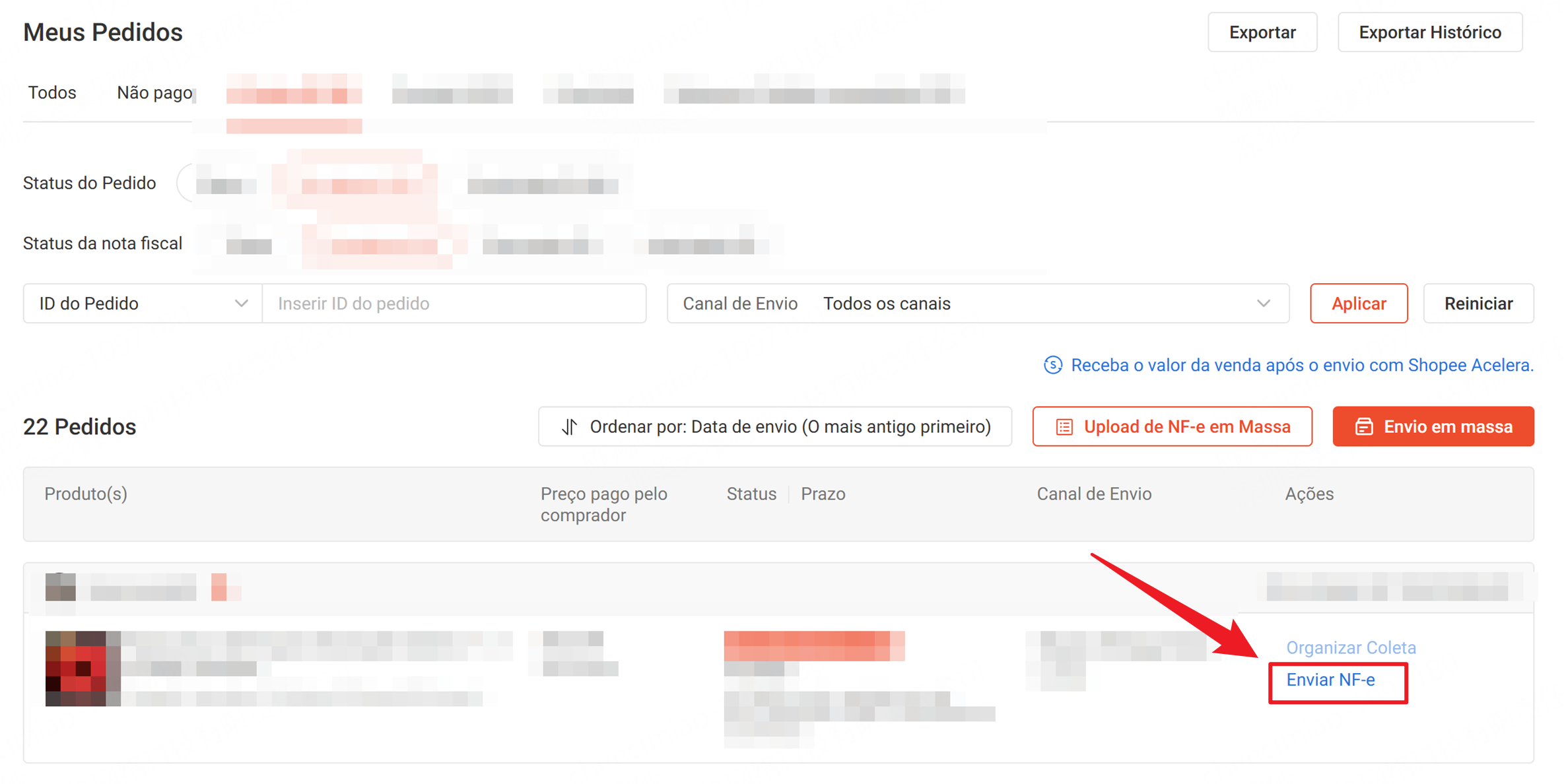 Acesse a plataforma Shopee >> Vá até a página de Pedidos >> Clique em “Enviar NF-e” >> "Enviar arquivo XML" ou "Informar chave de acesso"