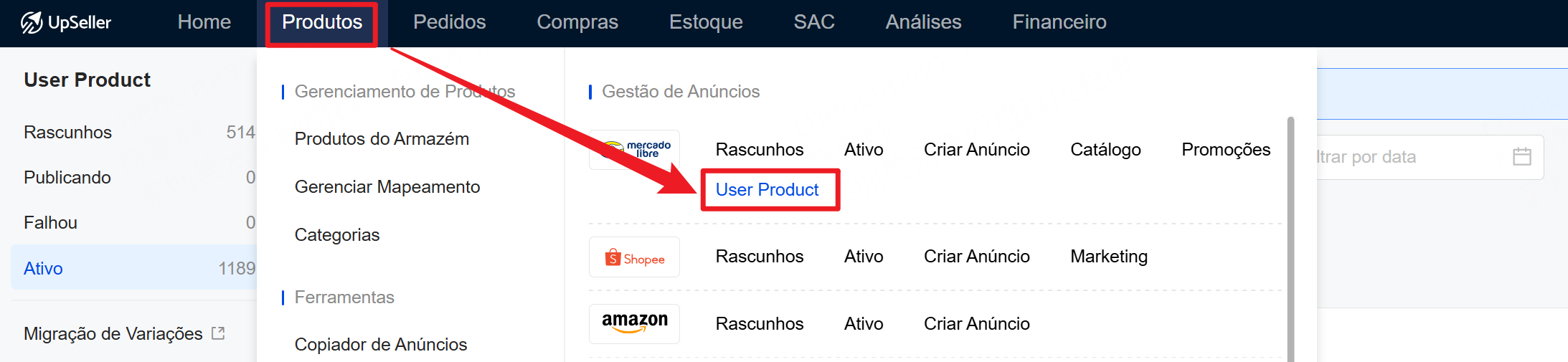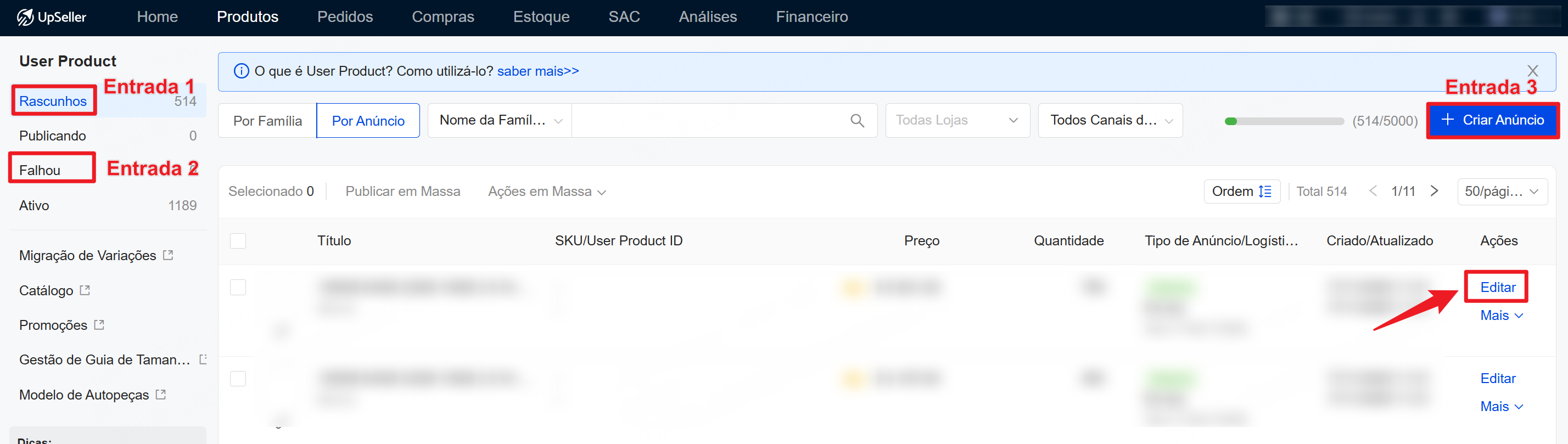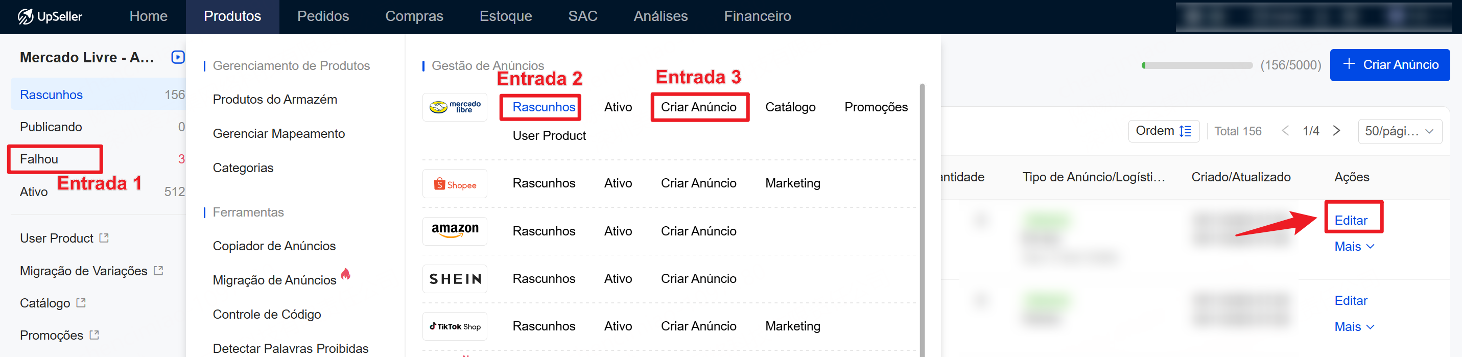 (1) Produtos >> Rascunhos / Falhou / Criar Anúncio >> Selecionar o anúncio e clicar em "Editar"