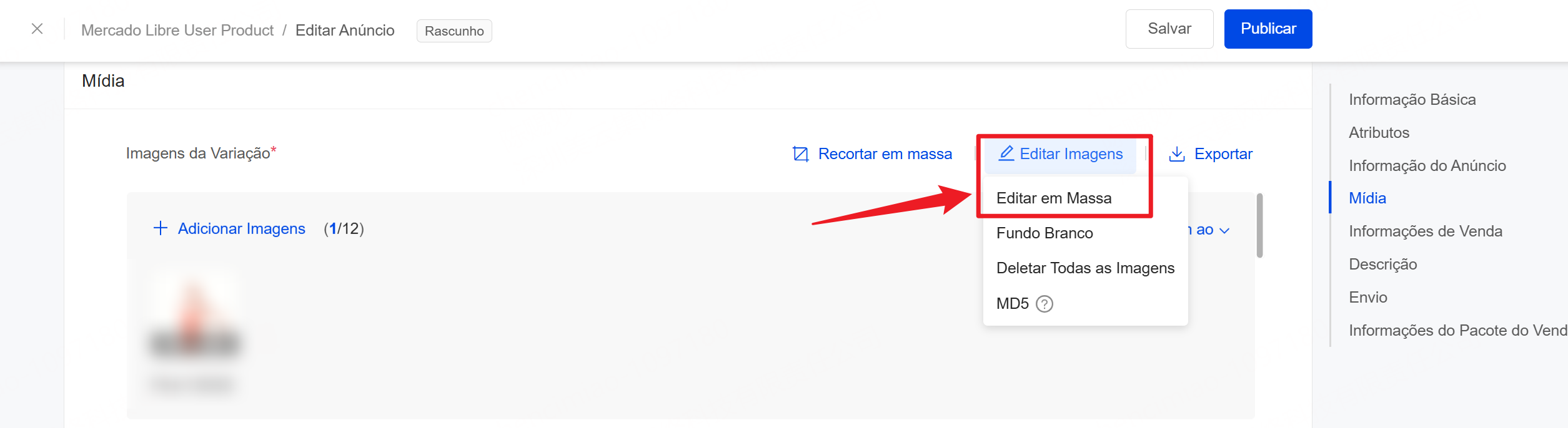 (1) Na página de edição de anúncios >> Clicar em "Editar Imagens - Editar em Massa"