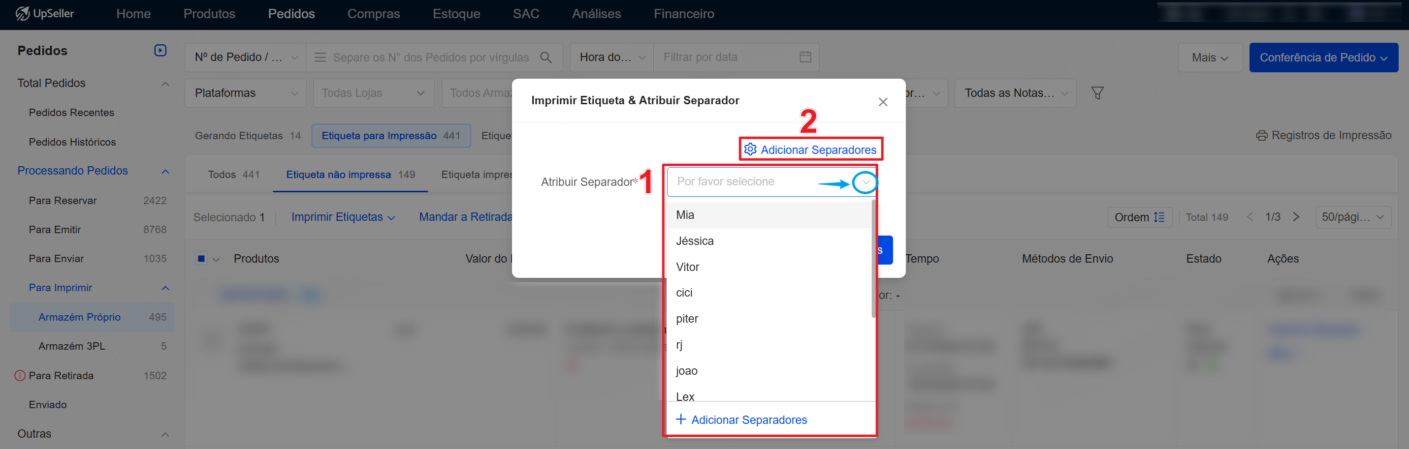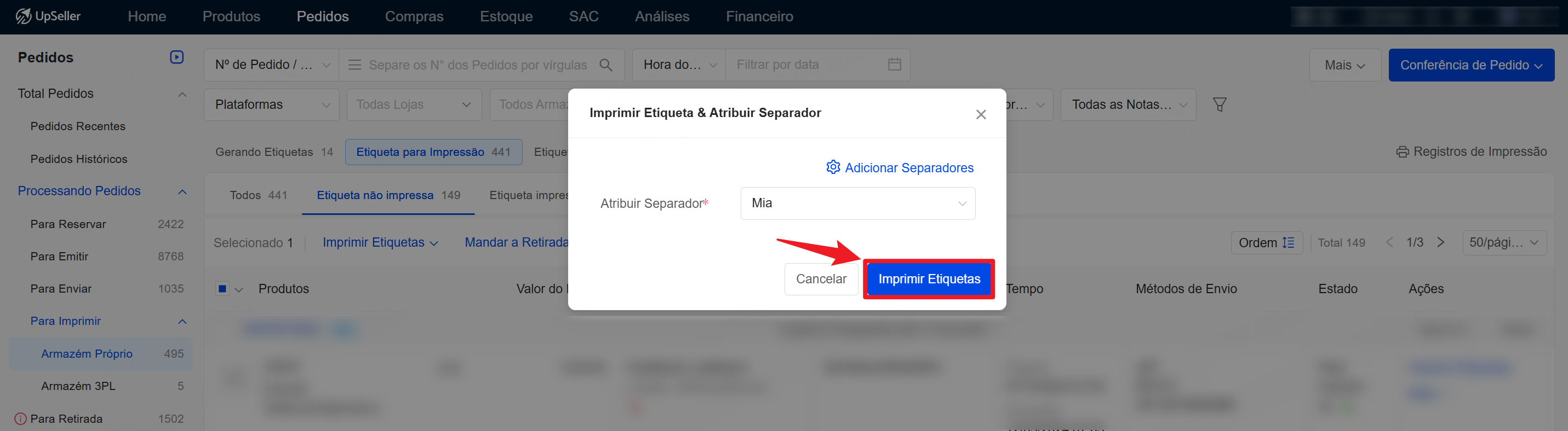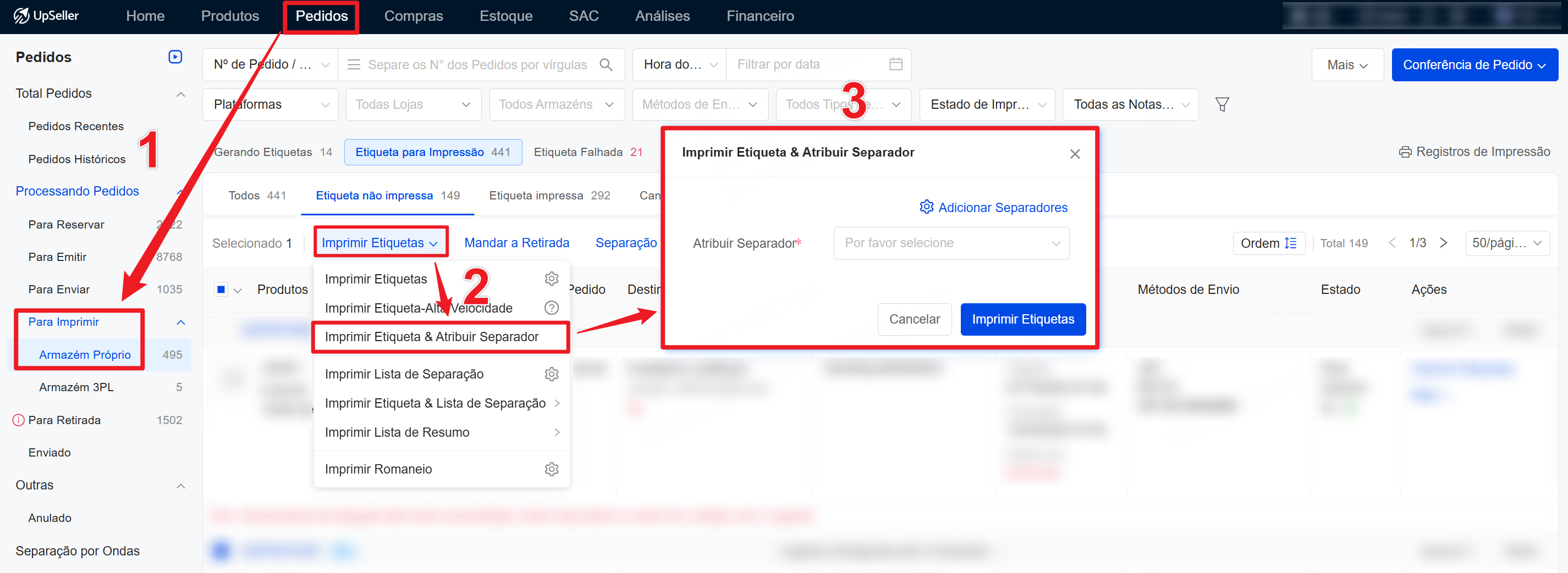 Passo 2: Imprimir etiqueta & Atribuir SeparadorOBS: Somente após configurar a etiqueta personalizada é possível imprimir a etiqueta e atribuir o separador. Consulte >> Como configurar uma etiqueta personalizada?1. Acesse Pedidos >> Para Imprimir >> Armazém Próprio >> Selecione os pedidos >> Imprimir Etiqueta & Atribuir Separador
