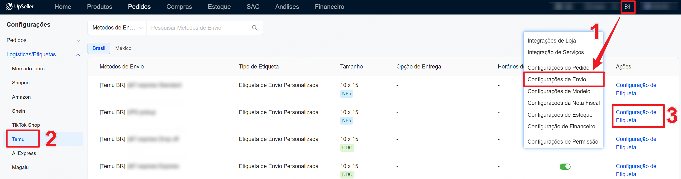 1. Acesse Configurações >> Configurações de Envio >> Temu >> Selecione o método de envio correspondente >> Clique em Configuração da Etiqueta