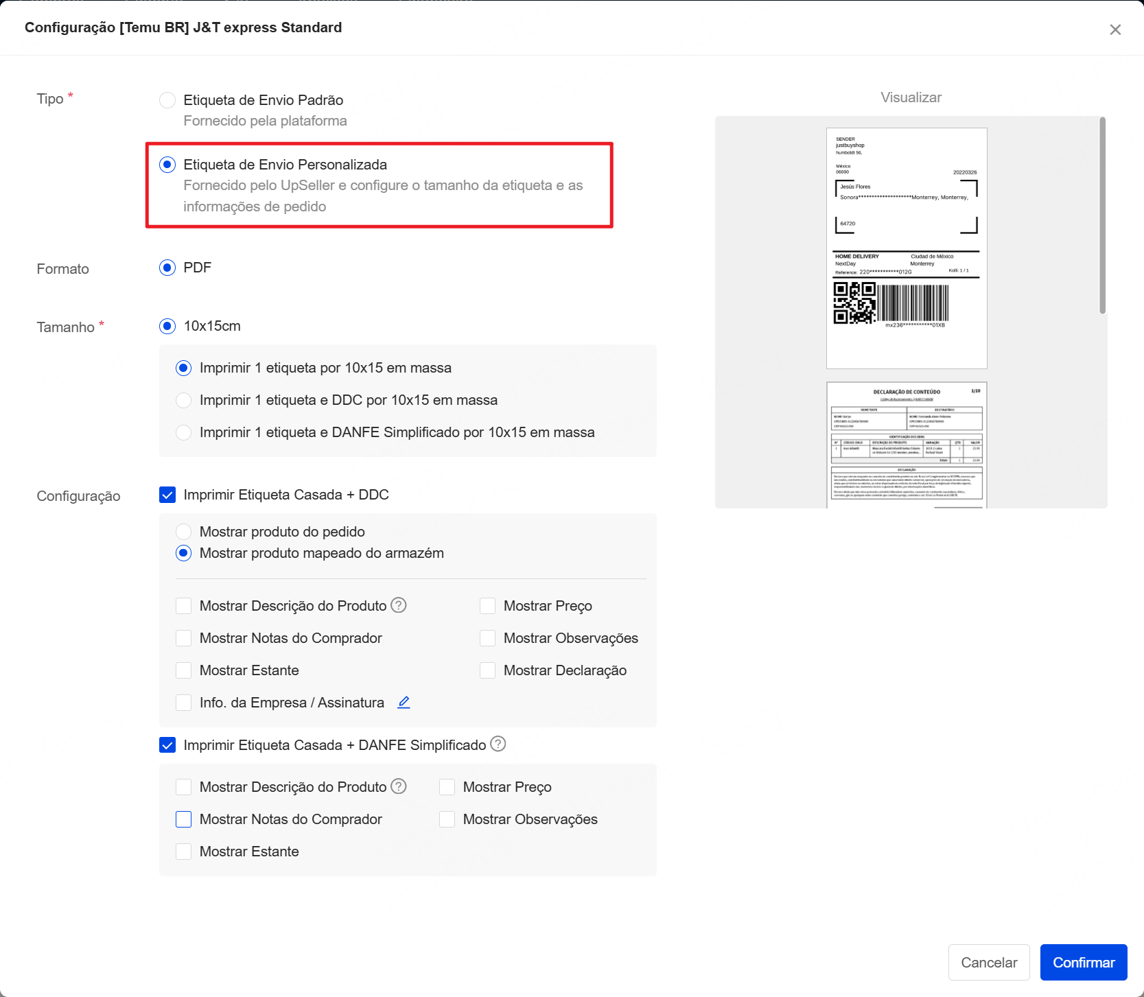 2. Marque a opção Etiqueta de Envio Personalizada >> Escolha o Formato e o Tamanho >> Selecione as informações que deseja imprimir conforme a sua necessidade, é possível adicionar a DDC e DANFE Simplificado, configurando também como essas informações serão exibidas >> Confirmar.