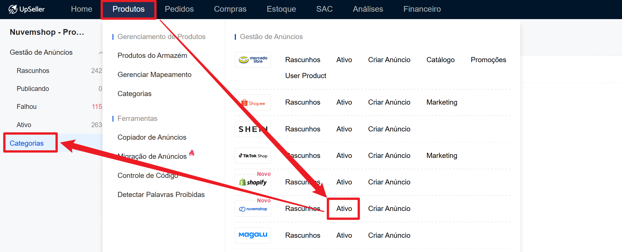 Entrada: Vá em Produtos >> Ativo >> Categorias