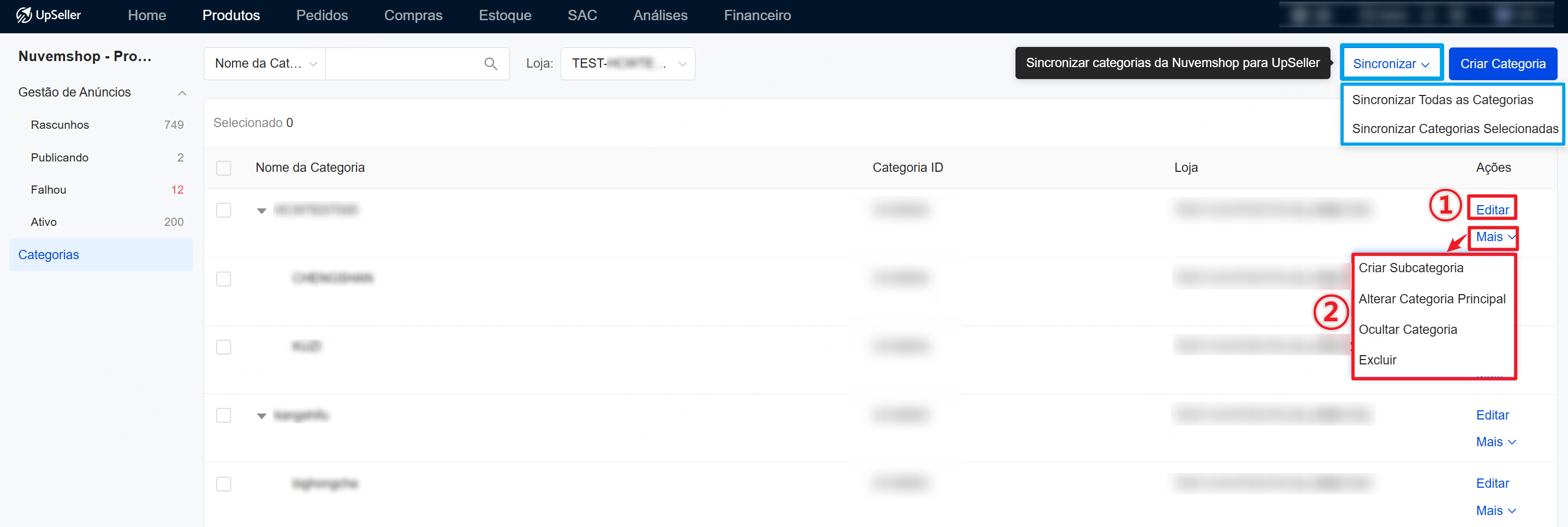 1. Ao ocultar uma categoria, todas as suas subcategorias associadas também serão ocultadas.