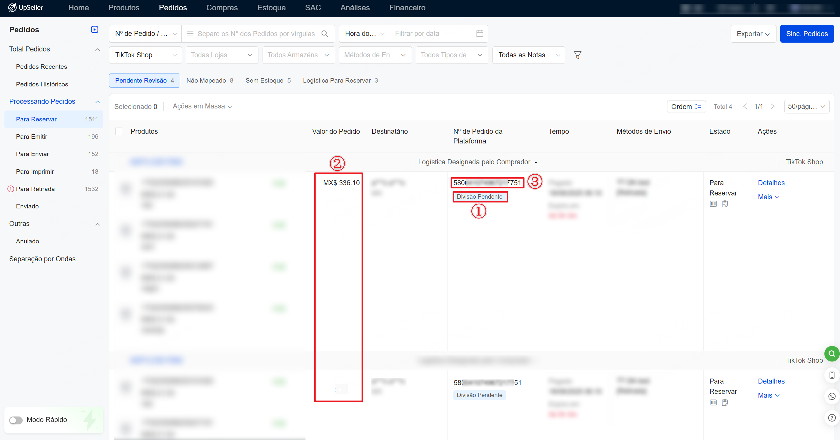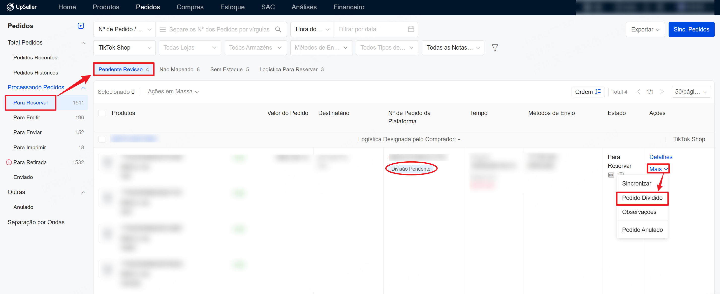 4. Os pedidos divididos mantêm o mesmo número de pedido da plataforma, porém cada pacote terá um número de pedido UpSeller diferente. O número do pedido original (antes de dividir) será usado para o primeiro pacote gerado.