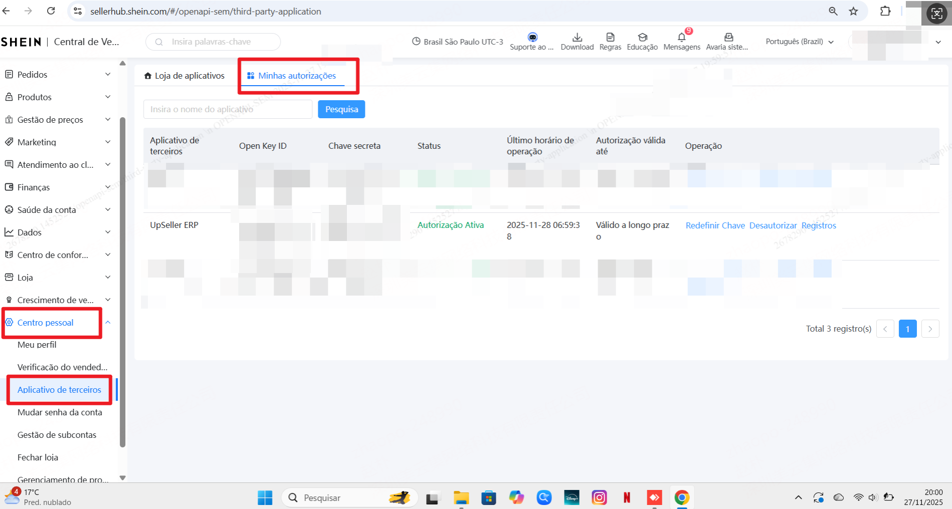 Acesse o SHEIN Seller Center, clique em Centro pessoal>> Aplicativos de terceiros>> Minhas autorizações , e você poderá visualizar.