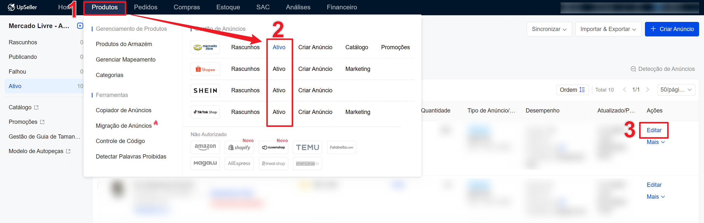 Acesse Produtos >> Plataforma >> Ativo >> Selecione o anúncio ao qual deseja adicionar novas variações >> Clique em Editar