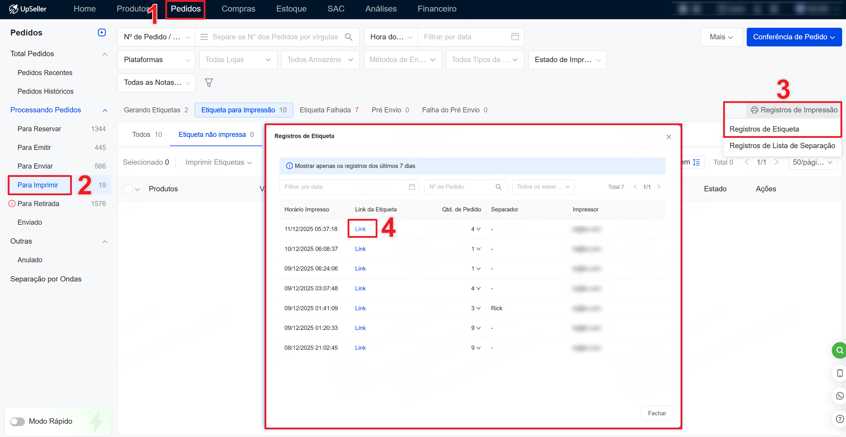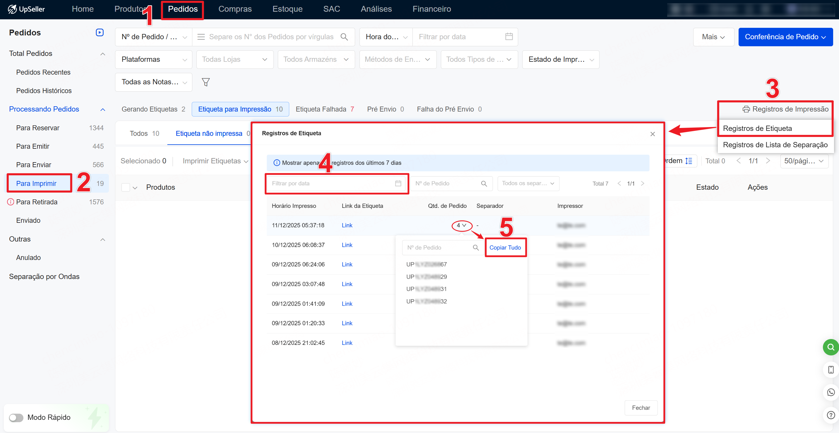 1. Pedidos >> No status Para Imprimir >> Registros de Impressão >> Registros de Etiqueta >> Filtrar a data de impressão >> Qtd. de Pedido >> Copiar os números de pedidos