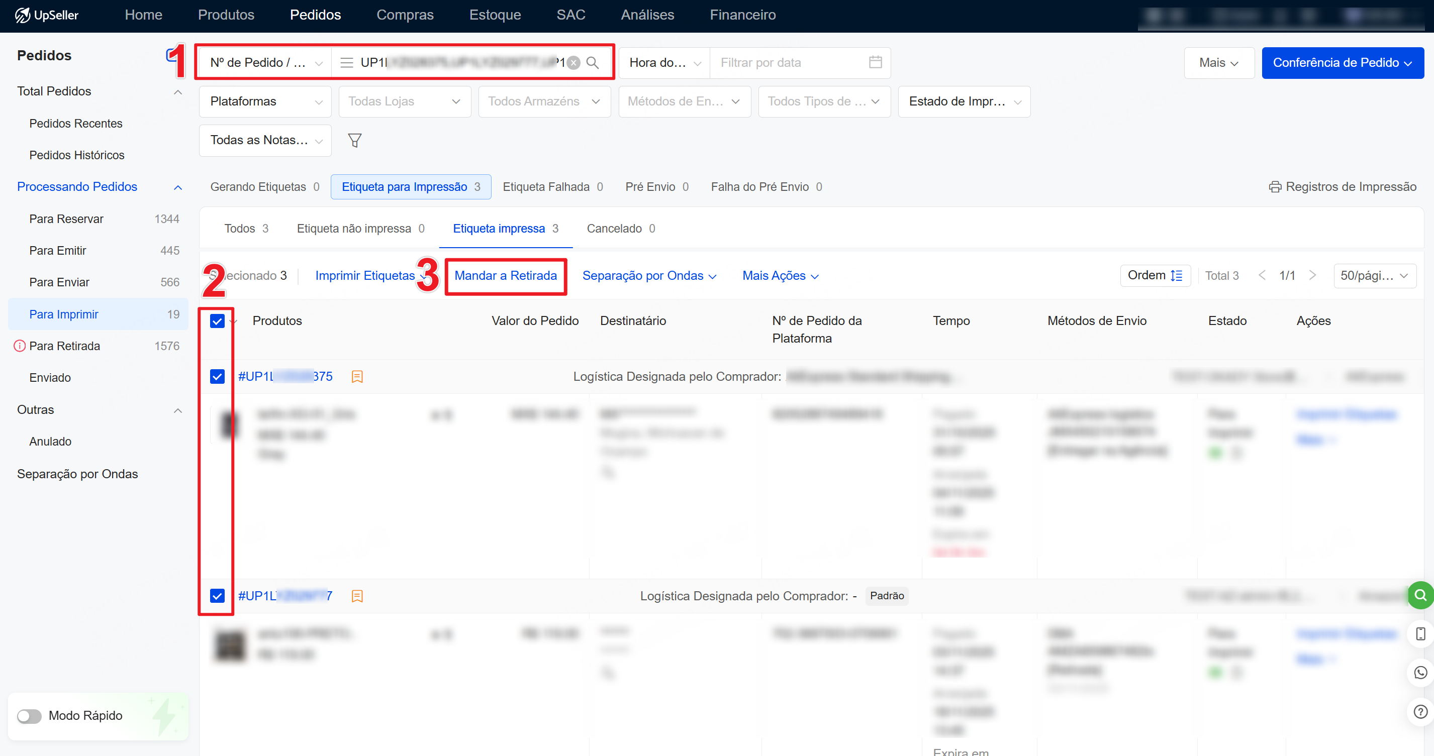 2. Pesquise os números de pedidos no status Para Imprimir >> Marcar os pedidos >> Mandar a Retirada