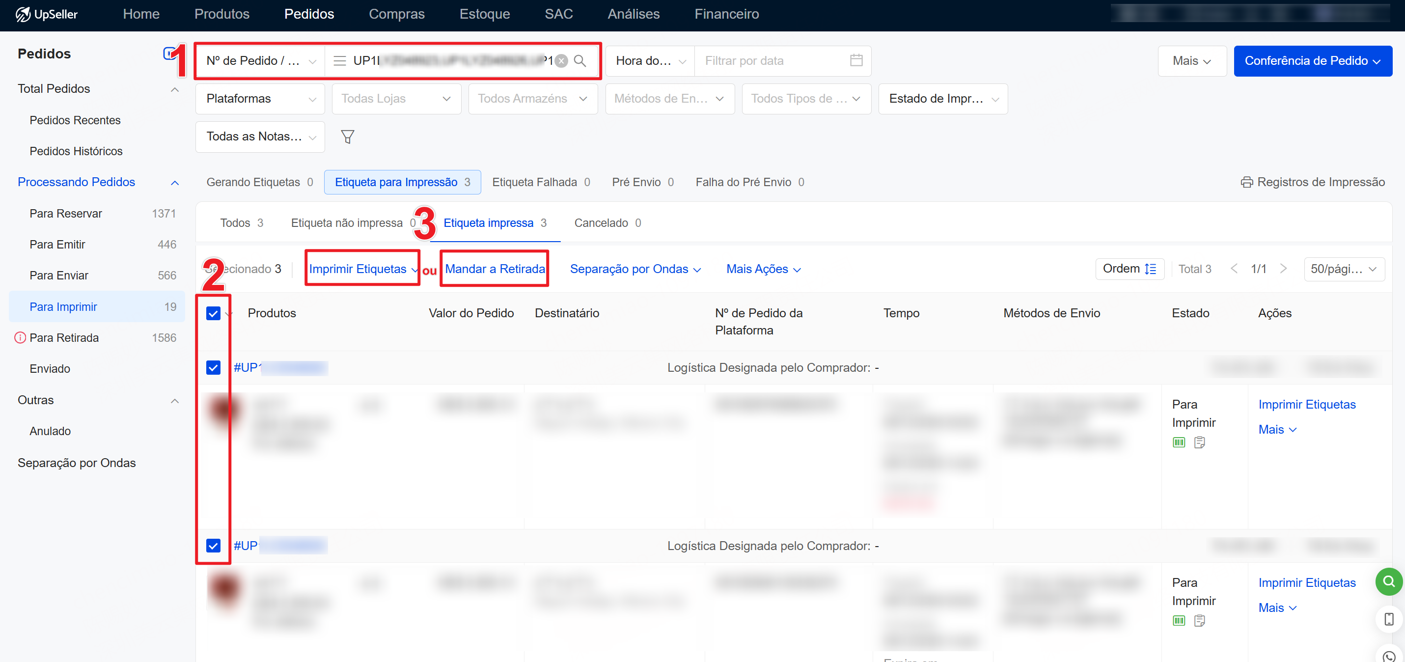 2. Pesquise os números de pedidos no status Para Imprimir / Para Retirada / Enviado >> Marcar os pedidos >> Imprimir etiquetas novamente ou Mandar a Retirada