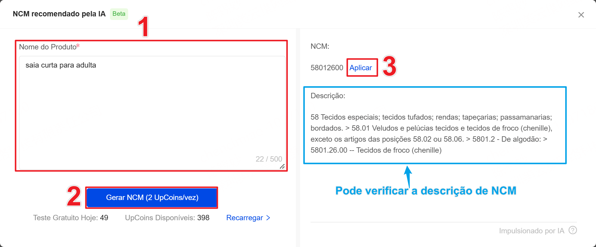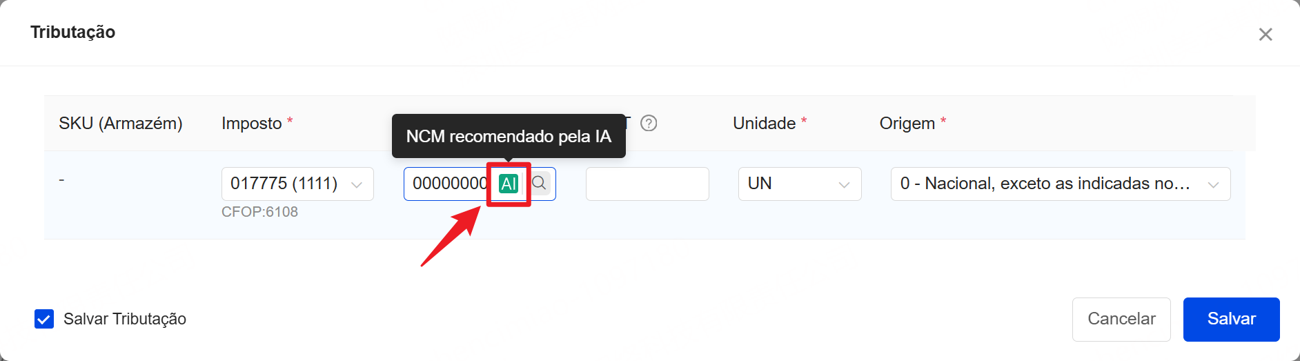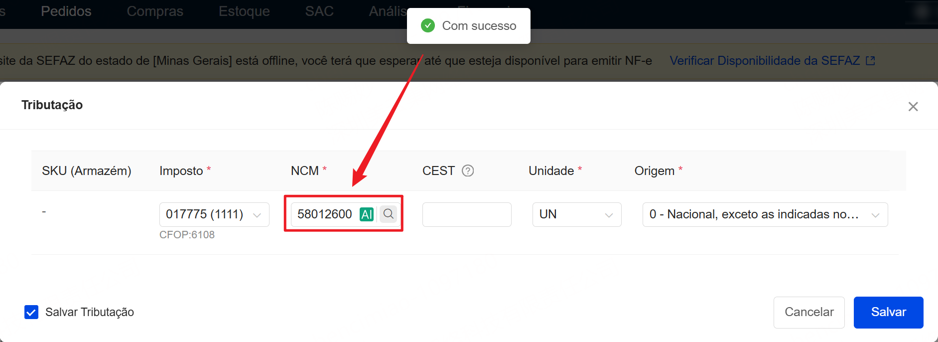 Ao utilizar a funcionalidade de recomendação de NCM por IA, basta inserir o título do produto para que o sistema recomende automaticamente o código NCM, aumentando significativamente a eficiência no processamento de pedidos.II. Observações