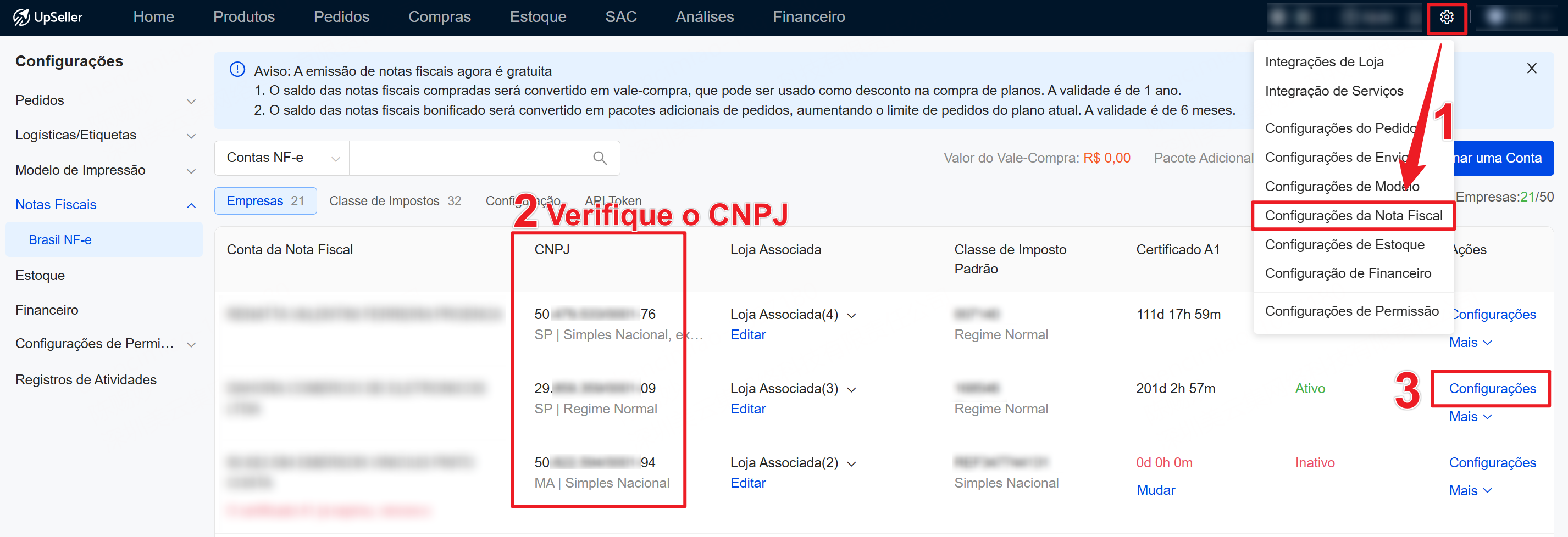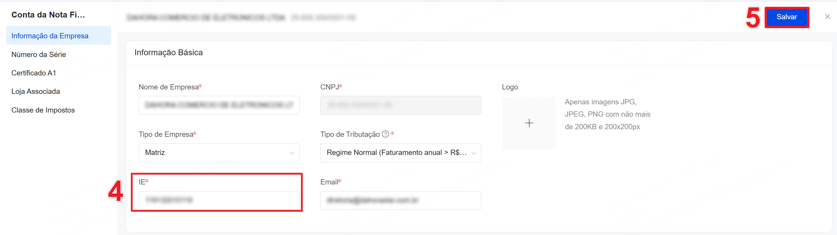 Passos: 1. Configurações da Nota Fiscal >> Encontre o CNPJ >> Clique em "Configurações" 2. Altere a IE do CNPJ confirmado >> Clique em "Salvar"