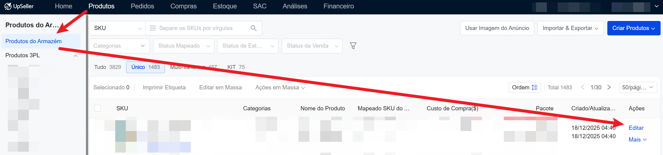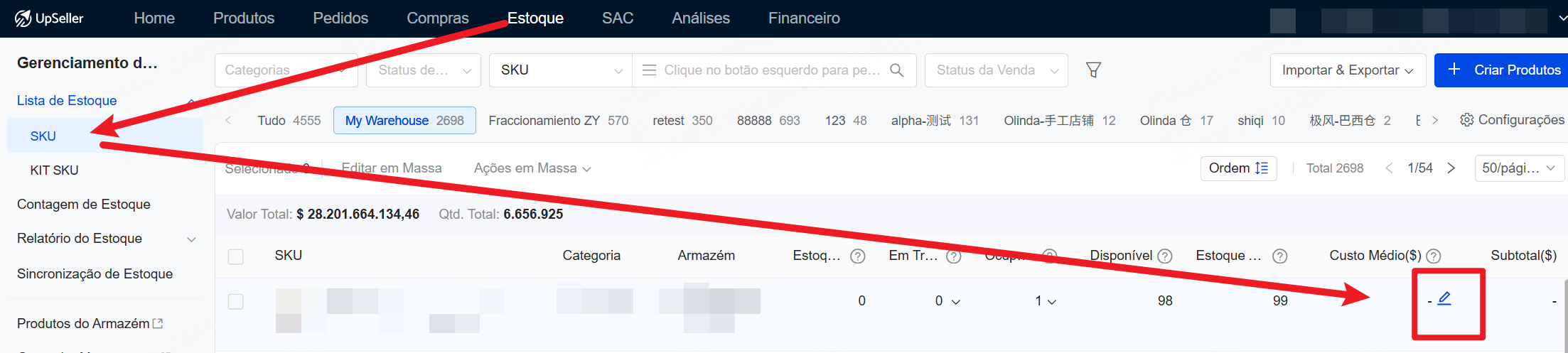 Clique em Estoque >> Lista de Estoque >> localize o armazém e o produto correspondentes >> Editar >> Salvar.