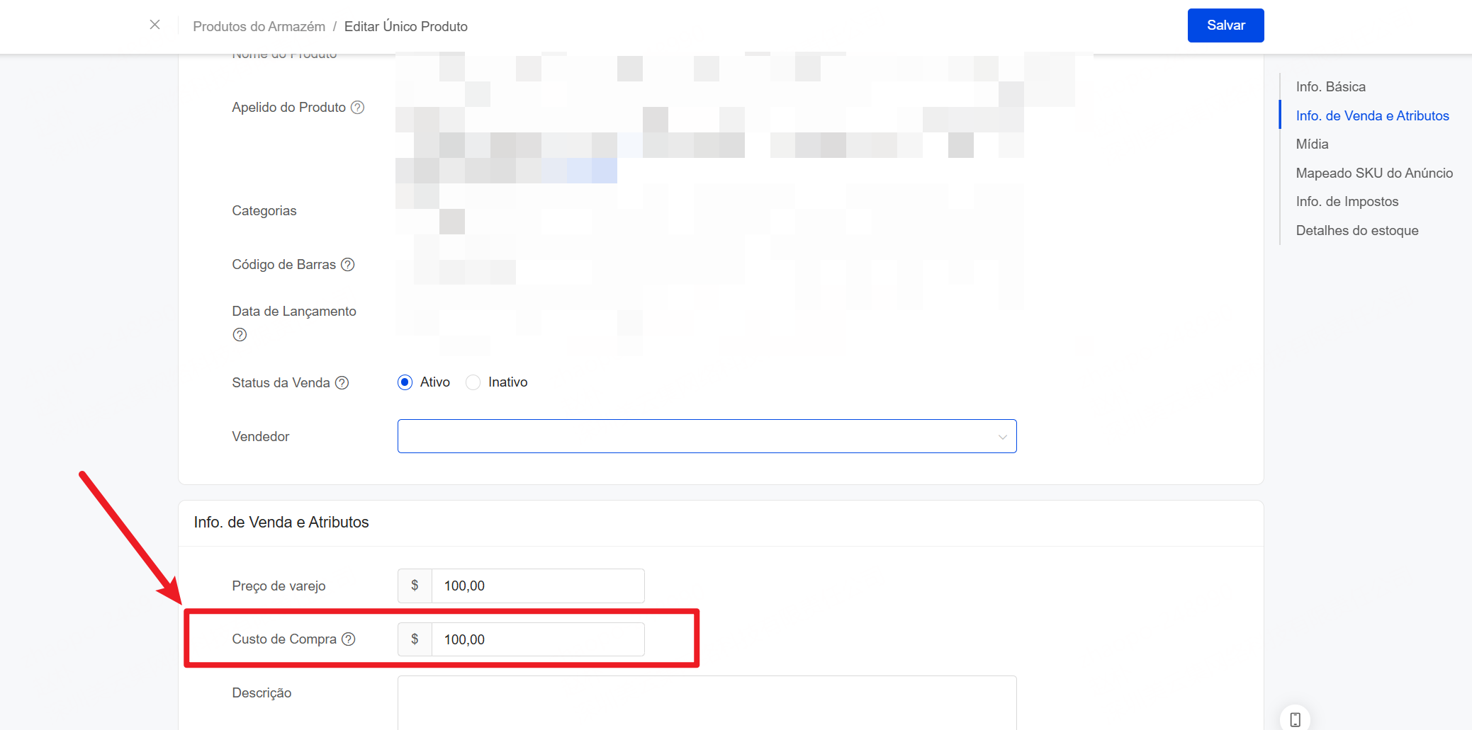 Clique em Módulo de Produtos >> Produtos do Armazém >> selecione o produto correspondente >> Editar >> adicionar o custo de compra >> Salvar.