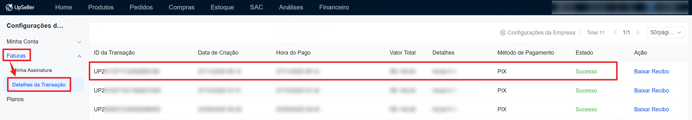 3. Captura de tela completa da página de detalhes da transação: Faturas >> Detalhes da Transação, exemplo: